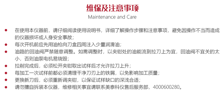 每加工一次試樣前都必須清理干凈刀刃上的鐵屑,以免影響加工質量;更換新刀后,必須重新調夾鉗,以保證試樣缺口的深淺合適;