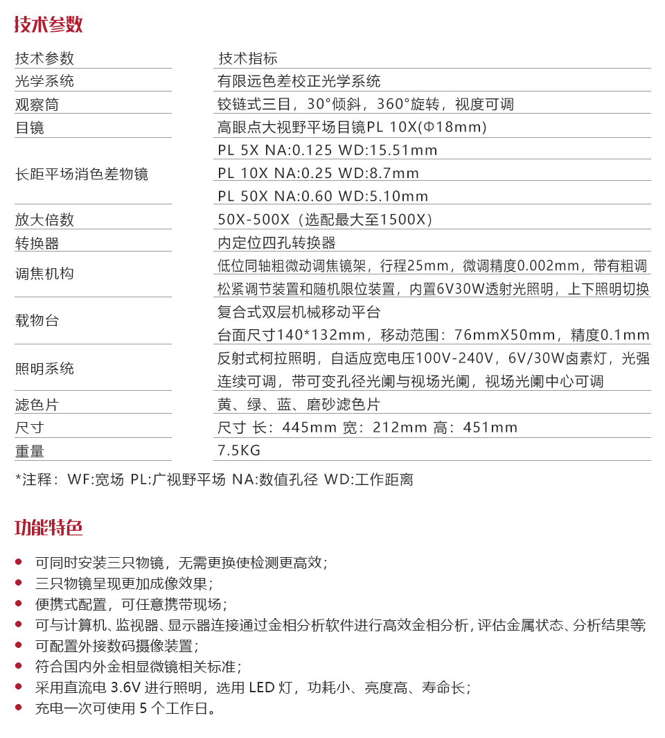 | 照明系統 | 反射式柯拉照明,自適應寬電壓100V-240V,6V/30W鹵素燈, 光強連續可調,帶可變孔徑光闌與視場光闌,視場光闌中心可調 |