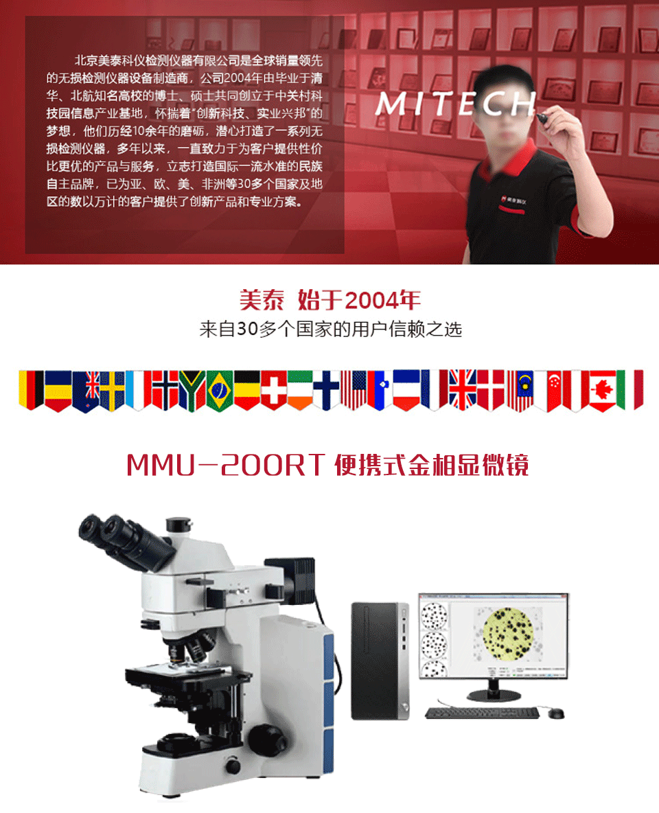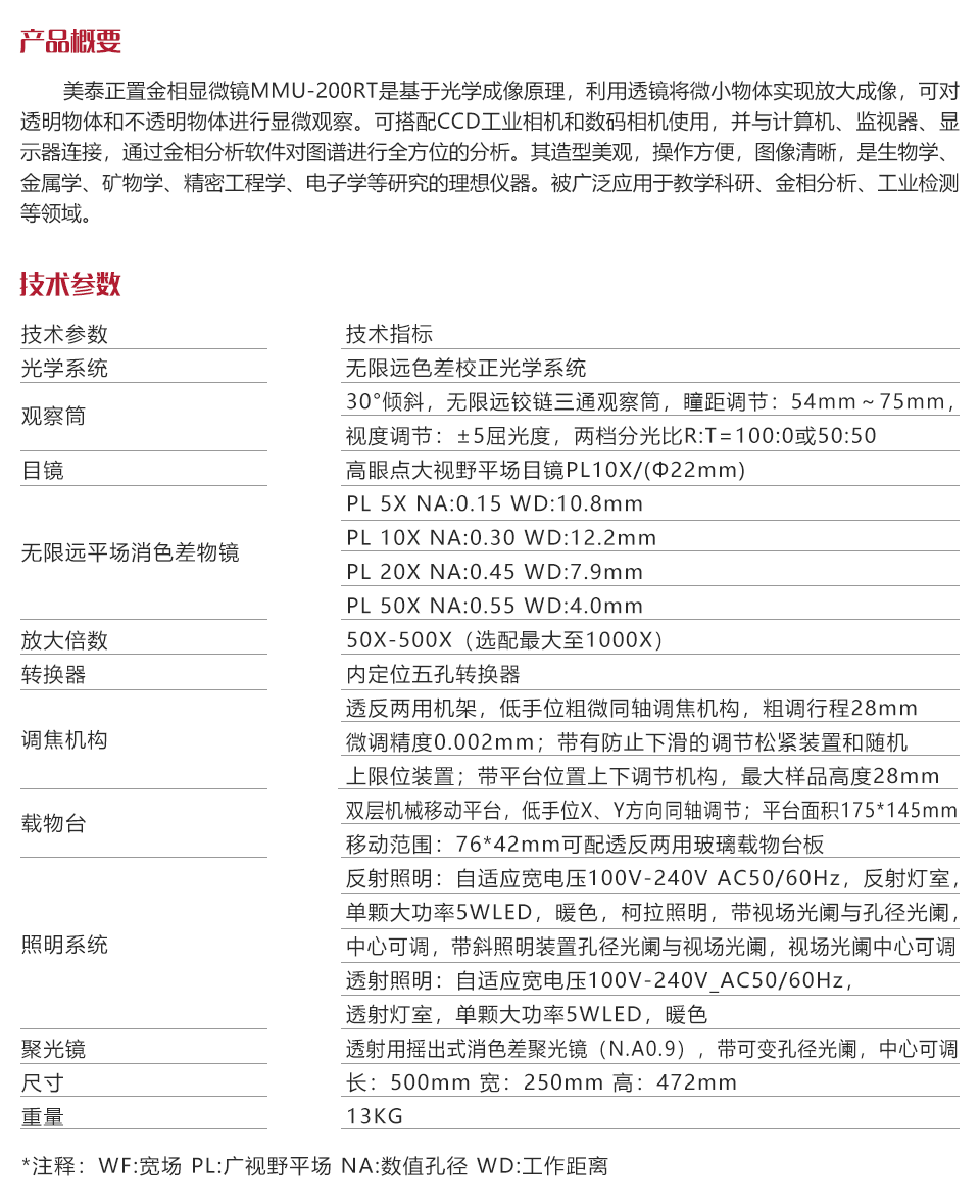 產品概述美泰正置金相顯微鏡MMU-200RT是基于光學成像原理,利用透鏡將微小物體實現放大成像,可對透明物體和不透明物體進行顯微觀察。可搭配CCD工業相機和數碼相機使用,并與計算機、監視器、顯示器連接,通過金相分析軟件對圖譜進行全方位的分析。其造型美觀,操作方便,圖像清晰,是生物學、金屬學、礦物學、精密工程學、電子學等研究的理想儀器。被廣泛應用于教學科研、金相分析、工業檢測等領域。