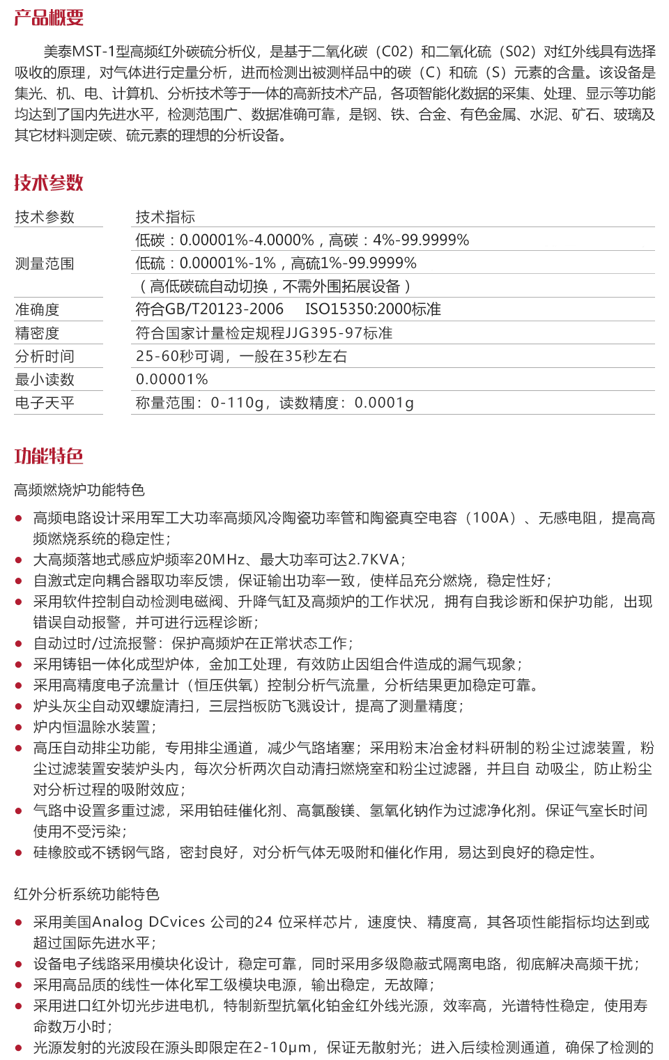 產品概述美泰MST-1型高頻紅外碳硫分析儀,是基于二氧化碳(C02)和二氧化硫(S02)對紅外線具有選擇吸收的原理,對氣體進行定量分析,進而檢測出被測樣品中的碳(C)和硫(S)元素的含量。該設備是集光、機、電、計算機、分析技術等于一體的高新技術產品,各項智能化數據的采集、處理、顯示等功能均達到了國內先進水平,檢測范圍廣、數據準確可靠,是鋼、鐵、合金、有色金屬、水泥、礦石、玻璃及其它材料測定碳、硫元素的理想的分析設備。