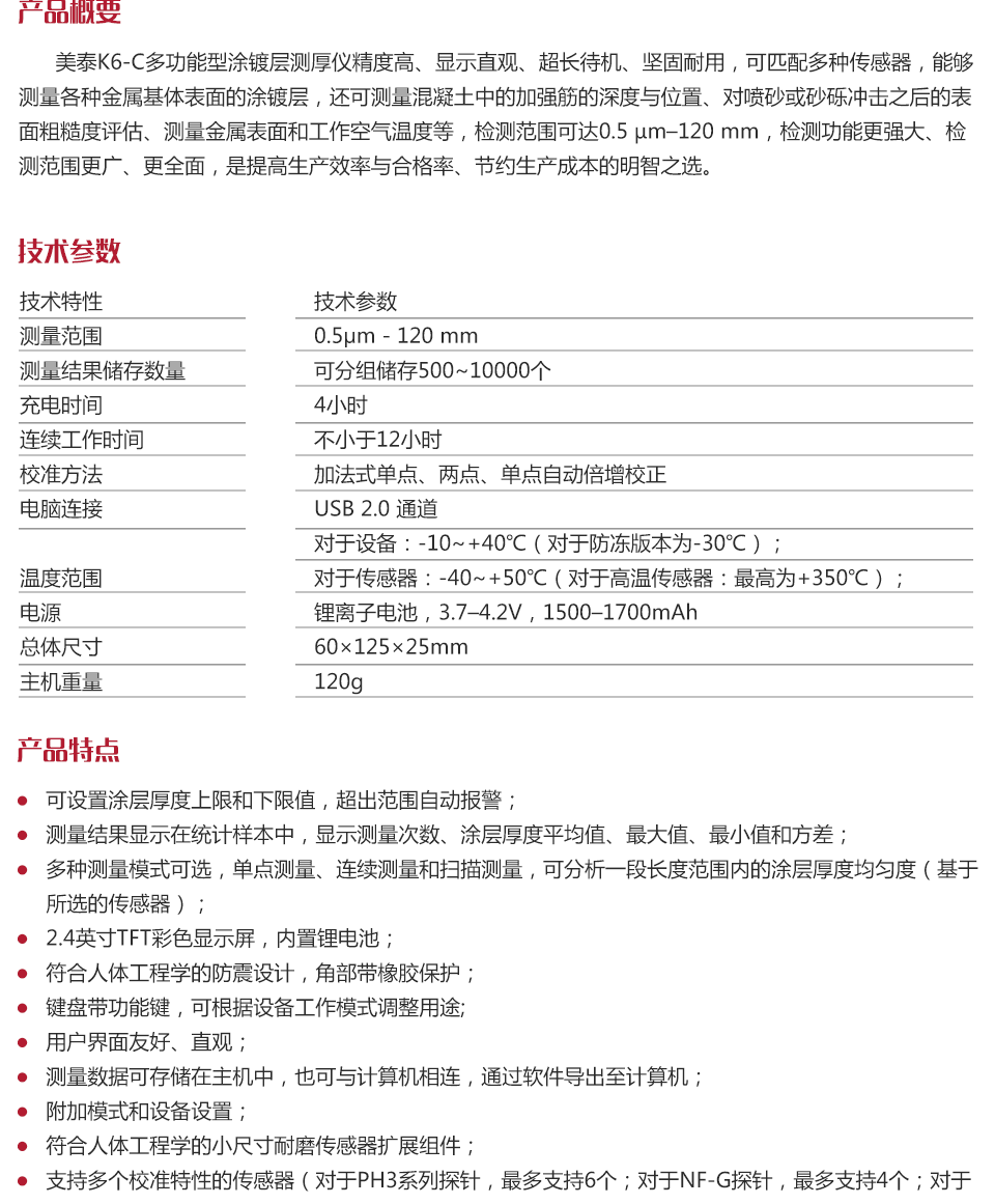 美泰K6-C多功能型涂鍍層測厚儀精度高、顯示直觀、超長待機、堅固耐用,可匹配多種傳感器,能夠測量各種金屬基體表面的涂鍍層,還可測量混凝土中的加強筋的深度與位置、對噴砂或砂礫沖擊之后的表面粗糙度評估、測量金屬表面和工作空氣溫度等,檢測范圍可達0.5 μm–120 mm,檢測功能更強大、檢測范圍更廣、更全面,是提高生產效率與合格率、節約生產成本的明智之選。