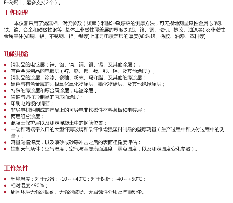 工作原理本儀器采用了渦流相、渦流參數(頻率)和脈沖磁感應的測厚方法,可無損地測量磁性金屬 (如鋼、鐵、鎳、合金和硬磁性鋼等) 基體上非磁性覆蓋層的厚度(如鋁、鉻、銅、琺瑯、橡膠、油漆等),及非磁性金屬基體(如銅、鋁、不銹鋼、鋅、錫等)上非導電覆蓋層的厚度(如:琺瑯、橡膠、油漆、塑料等)