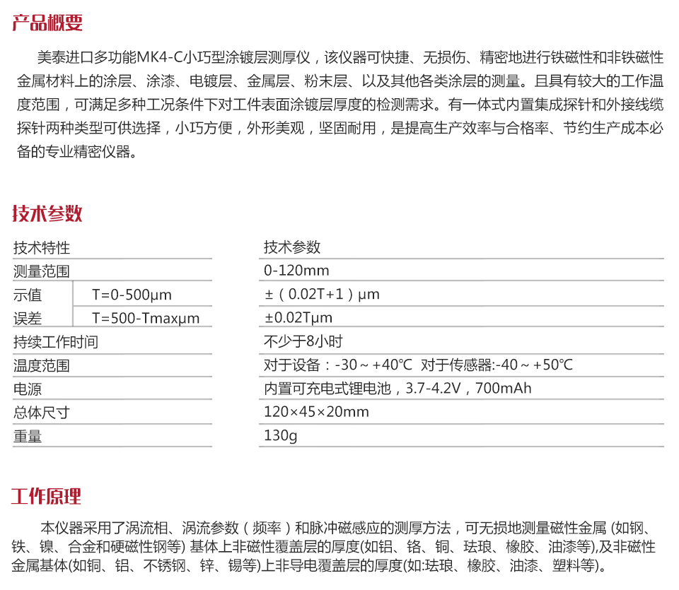 產(chǎn)品概述美泰進(jìn)口多功能MK4-C小巧型涂鍍層測(cè)厚儀,該儀器可快捷、無(wú)損傷、精密地進(jìn)行鐵磁性和非鐵磁性金屬材料上的涂層、涂漆、電鍍層、金屬層、粉末層、以及其他各類涂層的測(cè)量。且具有較大的工作溫度范圍,可滿足多種工況條件下對(duì)工件表面涂鍍層厚度的檢測(cè)需求。有一體式內(nèi)置集成探針和外接線纜探針兩種類型可供選擇,小巧方便,外形美觀,堅(jiān)固耐用,是提高生產(chǎn)效率與合格率、節(jié)約生產(chǎn)成本必備的專業(yè)精密儀器。