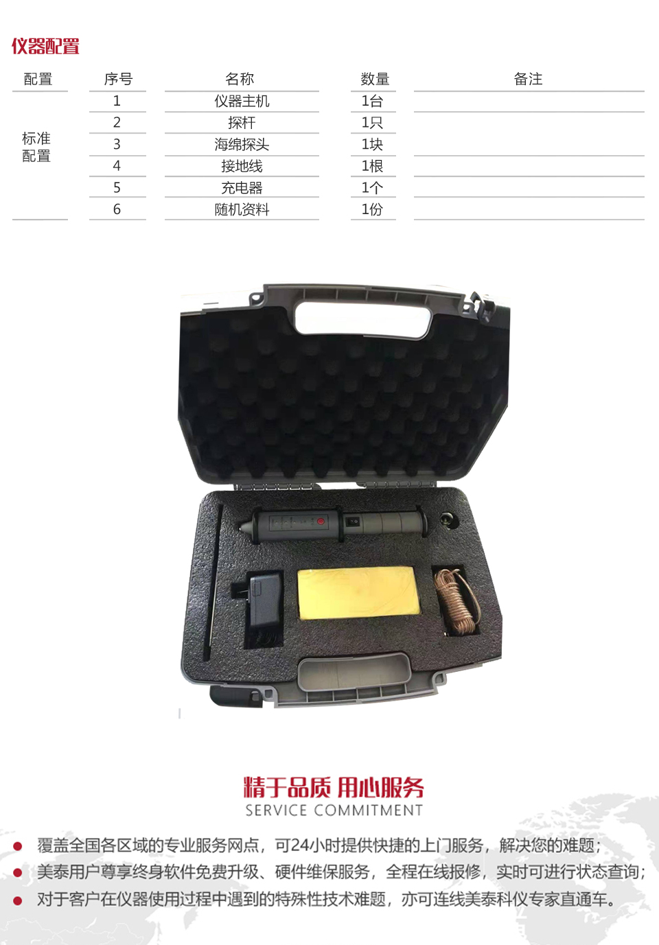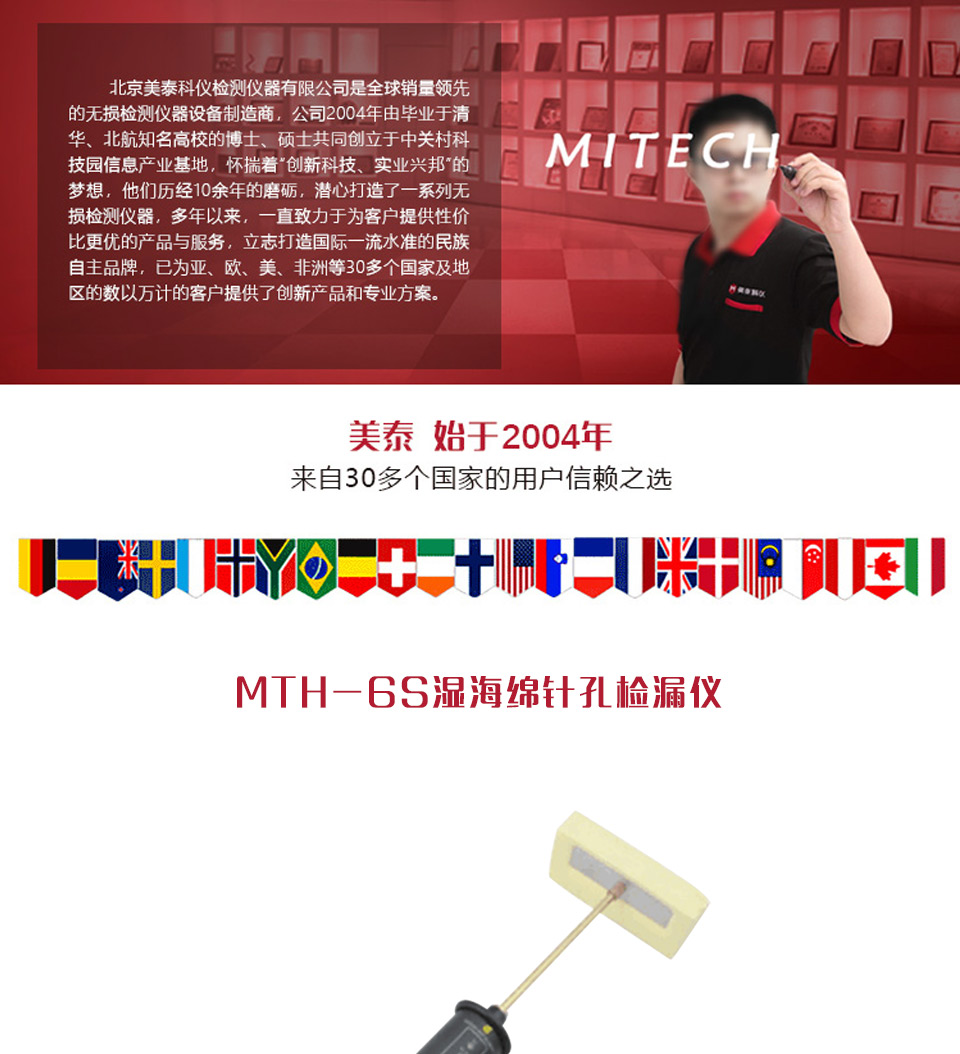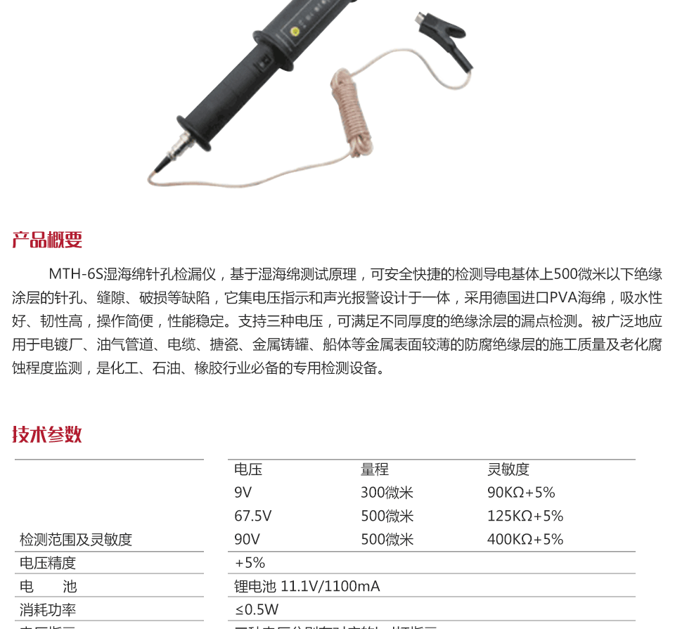 產品概述MTH-6S濕海綿針孔檢漏儀,基于濕海綿測試原理,可安全快捷的檢測導電基體上500微米以下絕緣涂層的針孔、縫隙、破損等缺陷,它集電壓指示和聲光報警設計于一體,采用德國進口PVA海綿,吸水性好、韌性高,操作簡便,性能穩定。支持三種電壓,可滿足不同厚度的絕緣涂層的漏點檢測。被廣泛地應用于電鍍廠、油氣管道、電纜、搪瓷、金屬鑄罐、船體等金屬表面較薄的防腐絕緣層的施工質量及老化腐蝕程度監測,是化工、石油、橡膠行業必備的專用檢測設備。