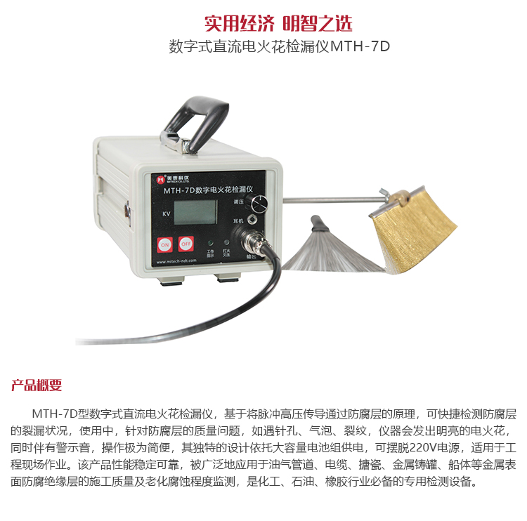 產(chǎn)品概述MTH-7D型數(shù)字式直流電火花檢漏儀,基于將脈沖高壓傳導(dǎo)通過防腐層的原理,可快捷檢測防腐層的裂漏狀況。使用中,針對防腐層的質(zhì)量問題,如遇針孔、氣泡、裂紋,儀器會(huì)發(fā)出明亮的電火花,同時(shí)伴有警示音,操作極為簡便,其獨(dú)特的設(shè)計(jì)依托大容量電池組供電,可擺脫220V電源,適用于工程現(xiàn)場作業(yè)。該產(chǎn)品性能穩(wěn)定可靠,被廣泛地應(yīng)用于油氣管道、電纜、搪瓷、金屬鑄罐、船體等金屬表面防腐絕緣層的施工質(zhì)量及老化腐蝕程度監(jiān)測,是化工、石油、橡膠行業(yè)必備的專用檢測設(shè)備。