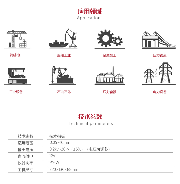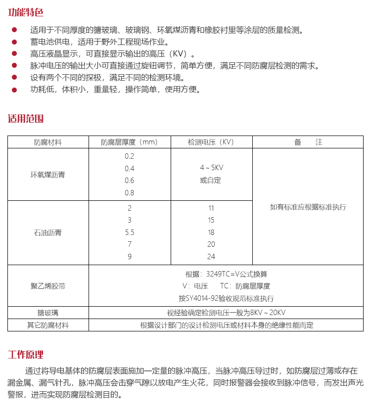可快速檢測搪玻璃罐外壁、閥門管道、玻璃鋼管道、環(huán)氧煤瀝青、橡膠襯里等防腐層的裂漏狀況。