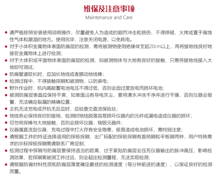 對小體積金屬物體表面防腐層檢測,被檢測的物體要用絕緣體支起20cm以上,再將接地線良好地接在金屬物體上檢測;