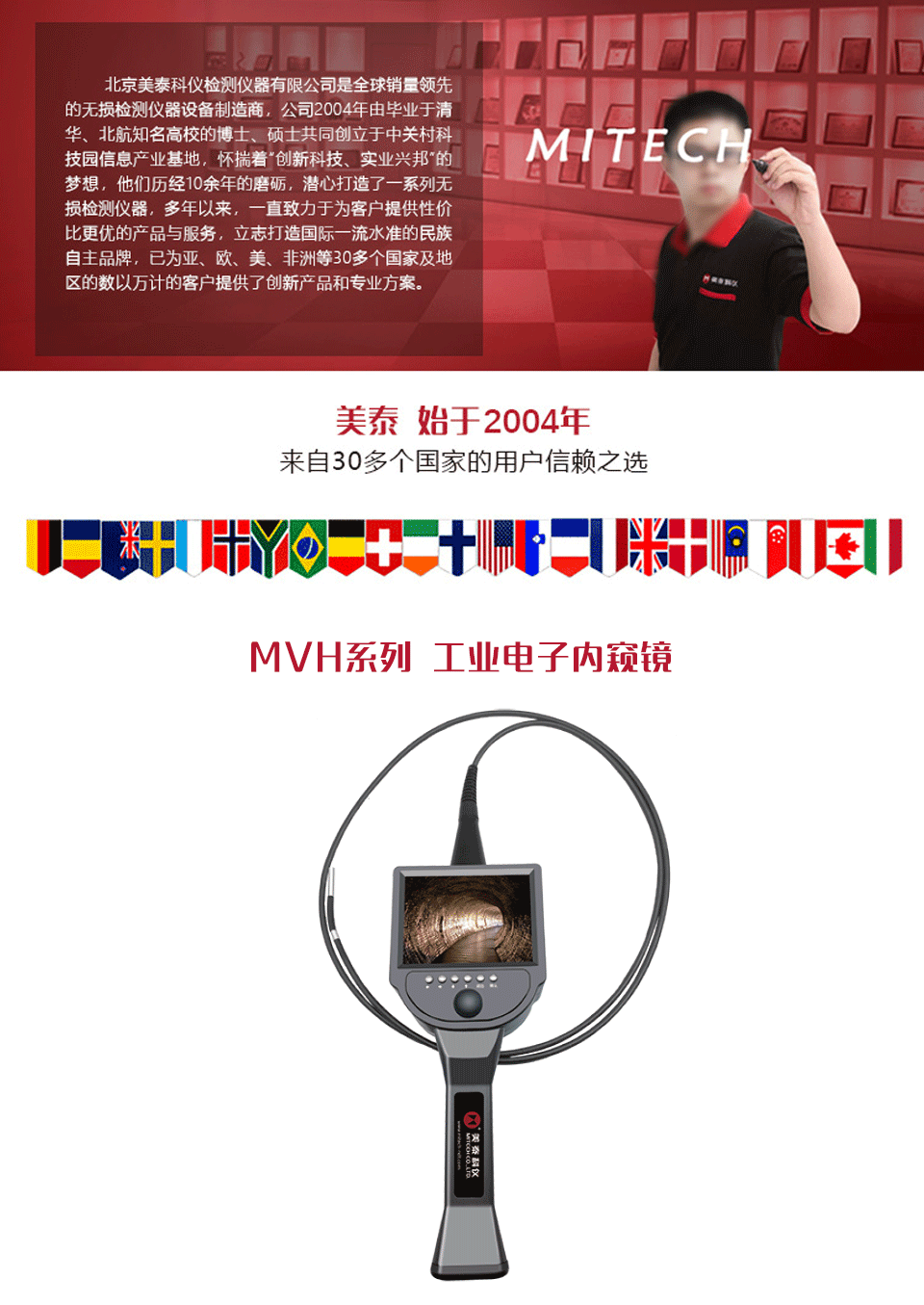 美泰電動360°MVH系列工業內窺鏡,基于CMOS圖像傳感器成像原理,能夠對人眼無法進行直接觀察的區域進行拍攝成像,高清顯示,從而實現無損檢測。美泰電動360°MVH系列內窺鏡是一款高精度視頻電子工業內窺鏡,采用彩色液晶顯示器以及高集成度CMOS圖像傳感器保證了視頻內窺鏡影像的清晰、逼真;功耗小,信號傳輸速度快,攜帶方便,操作簡易。可在不拆卸或不破壞組裝并停止設備運行的情況下對各種工業管路或復雜狹小的設備內部空間的腐蝕、裂紋、焊縫、異物、磨損及零部件內部的加工等情況進行全面細致的檢測。被廣泛應用于航天航空、石油化工、機械鑄造、國防軍事、電力生產、汽車交通等眾多領域,是工業設備檢測和維修等環節中重要的探測監控儀器。