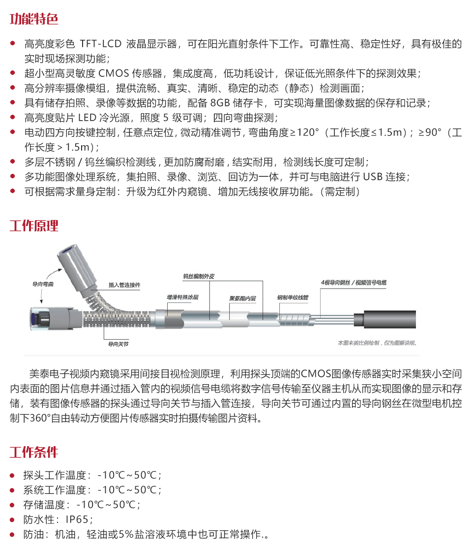 工作原理美泰電子視頻內窺鏡采用間接目視檢測原理,利用探頭頂端的CMOS圖像傳感器實時采集狹小空間內表面的圖片信息并通過插入管內的視頻信號電纜將數字信號傳輸至儀器主機從而實現圖像的顯示和存儲,裝有圖像傳感器的探頭通過導向關節與插入管連接,導向關節可通過內置的導向鋼絲在微型電機控制下360°自由轉動方便圖片傳感器實時拍攝傳輸圖片資料。