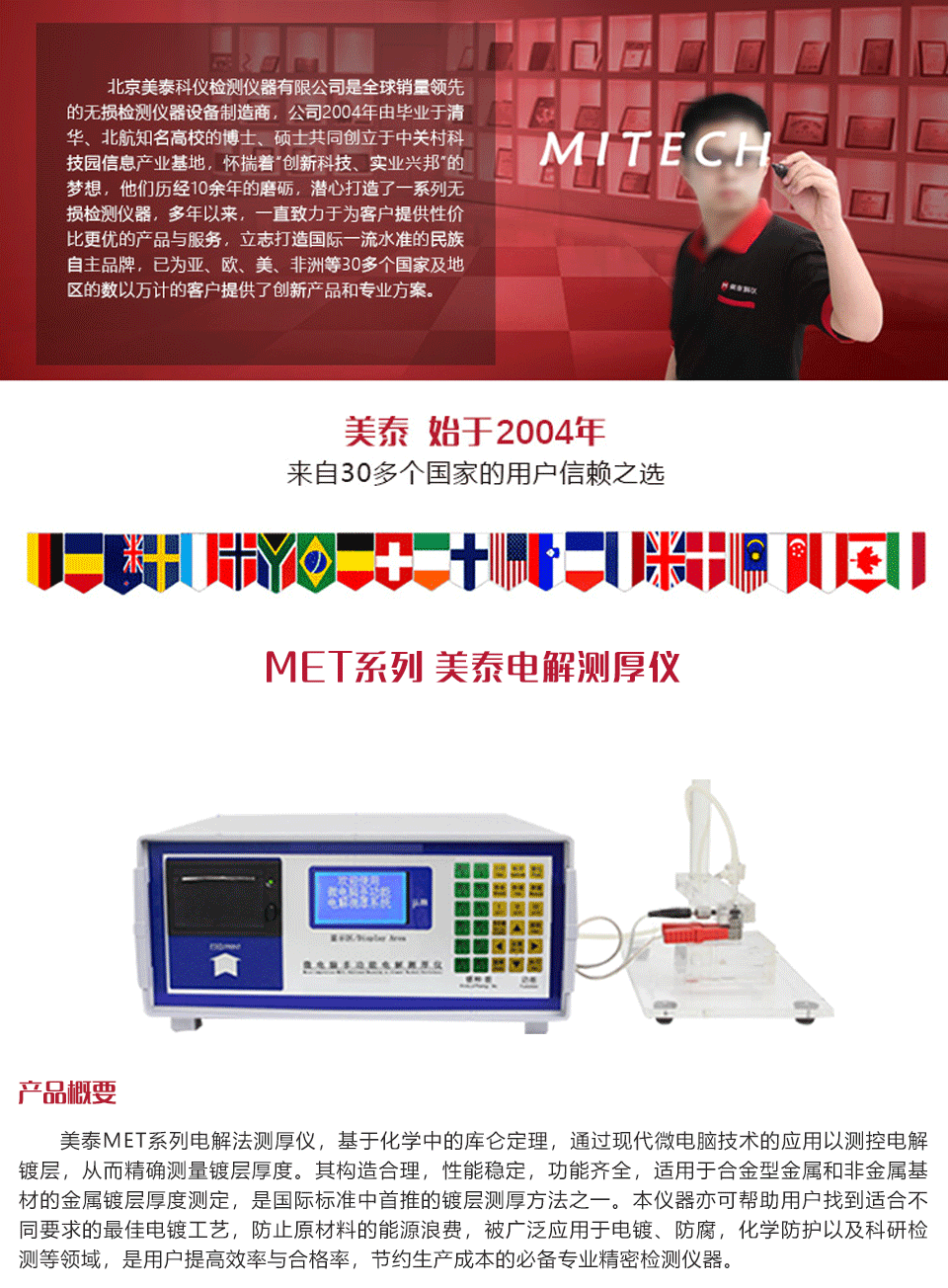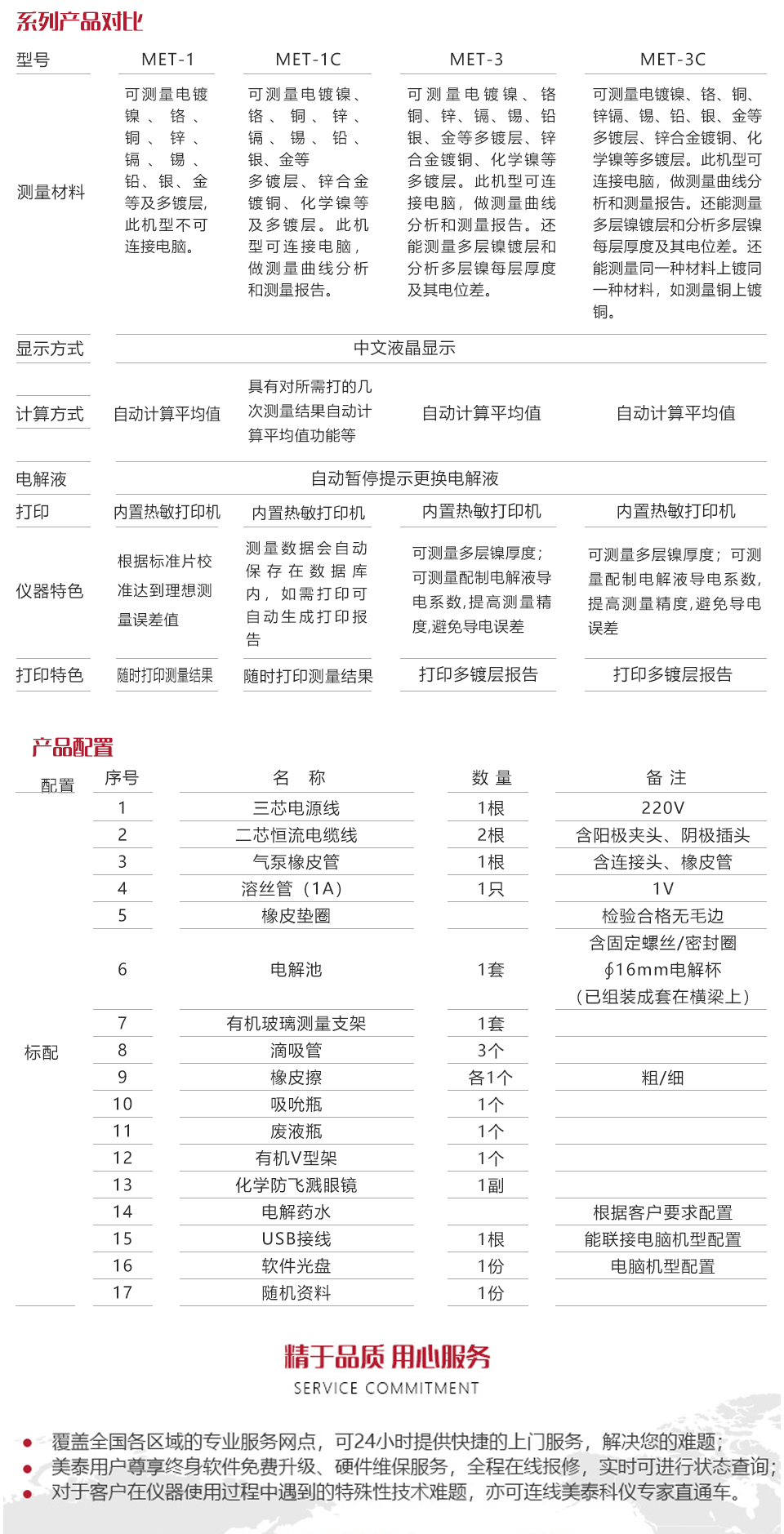 美泰MET系列電解法測厚儀,基于化學(xué)中的庫侖定理,通過現(xiàn)代微電腦技術(shù)的應(yīng)用以測控電解鍍層,從而精確測量鍍層厚度。其構(gòu)造合理,性能穩(wěn)定,功能齊全,適用于合金型金屬和非金屬基材的金屬鍍層厚度測定,是國際標準中首推的鍍層測厚方法之一。本儀器亦可幫助用戶找到適合不同要求的最佳電鍍工藝,防止原材料的能源浪費,被廣泛應(yīng)用于電鍍、防腐,化學(xué)防護以及科研檢測等領(lǐng)域,是用戶提高效率與合格率,節(jié)約生產(chǎn)成本的必備專業(yè)精密檢測儀器。