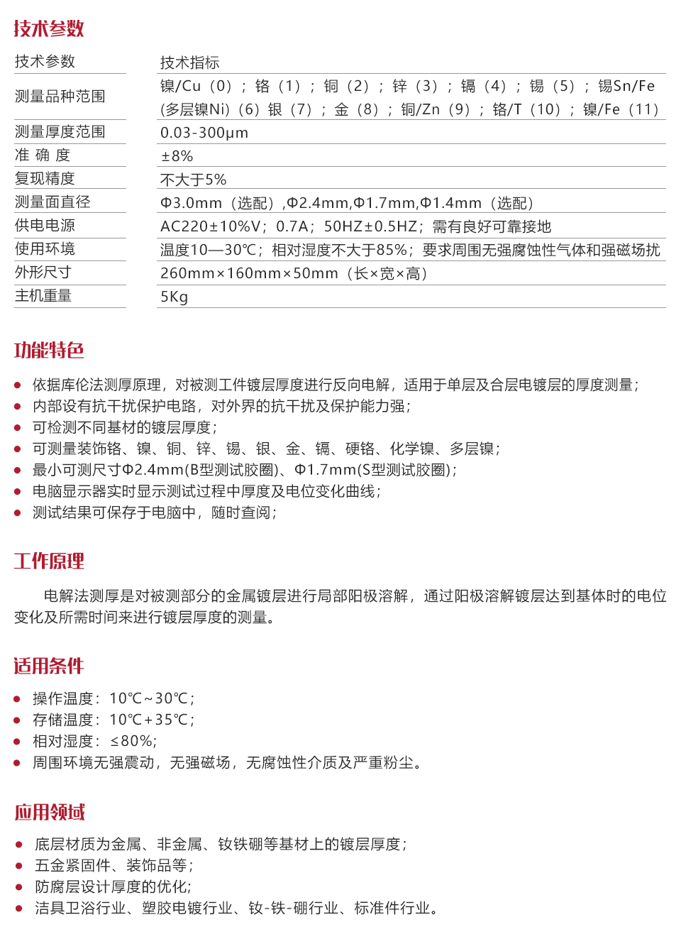 儀器特點l 依據(jù)庫倫法測厚原理,對被測工件鍍層厚度進行反向電解,適用于單層及合層電鍍層的厚度測量;