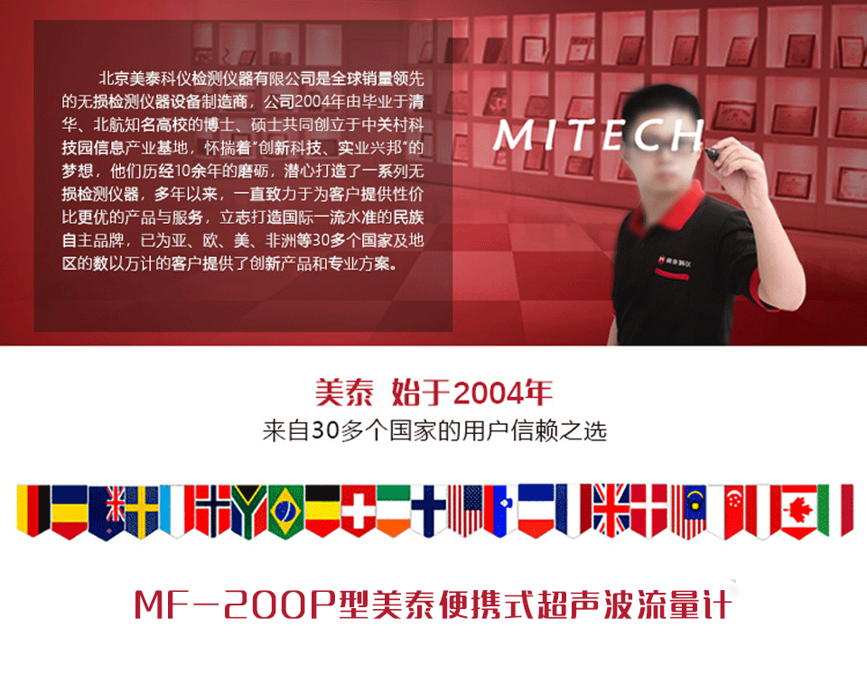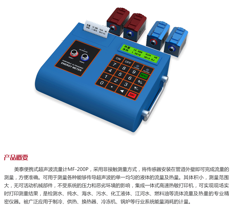 產品概述美泰便攜式超聲波流量計MF-200P,采用非接觸測量方式,將傳感器安裝在管道外壁即可完成流量的測量,方便準確??捎糜跍y量各種能夠傳導超聲波的單一均勻的液體的流量及熱量。其體積小,測量范圍大,無可活動機械部件,不受系統的壓力和惡劣環境的影響,集成一體式高速熱敏打印機,可實現現場實時打印測量結果,是檢測水、純水、海水、污水、化工液體、江河水、燃料油等流體流量及熱量的專業精密儀器。被廣泛應用于制冷、供熱、換熱器、冷凍機、鍋爐等行業系統能量消耗的計量。
