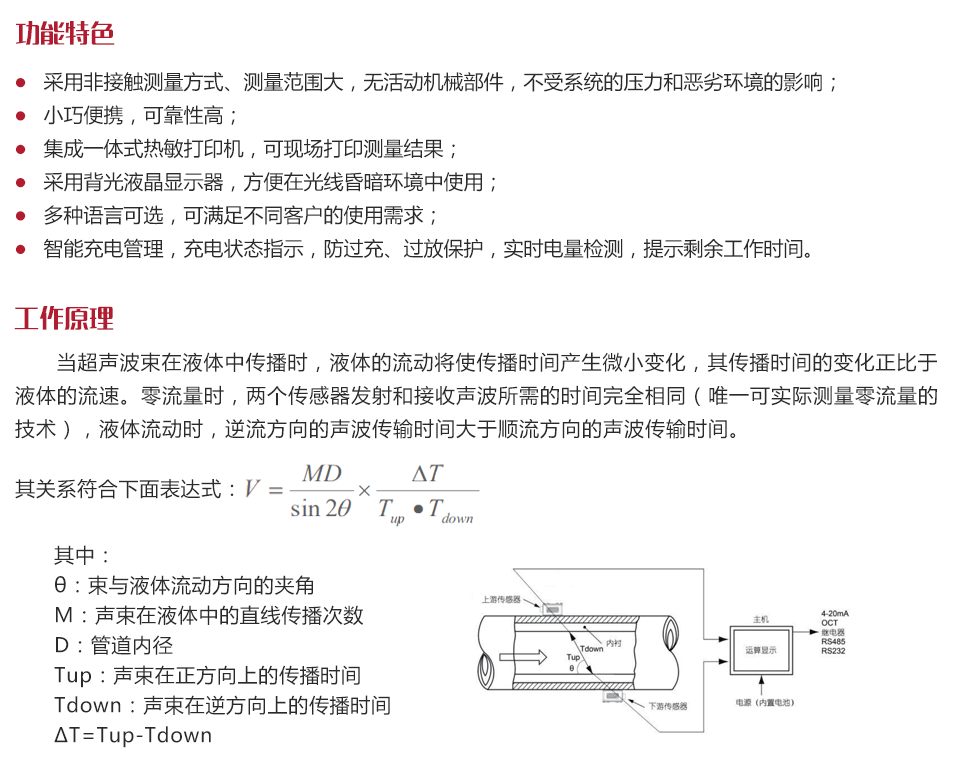 工作原理當超聲波束在液體中傳播時,液體的流動將使傳播時間產生微小變化,其傳播時間的變化正比于液體的流速。零流量時,兩個傳感器發射和接收聲波所需的時間完全相同(唯一可實際測量零流量的技術),液體流動時,逆流方向的聲波傳輸時間大于順流方向的聲波傳輸時間。