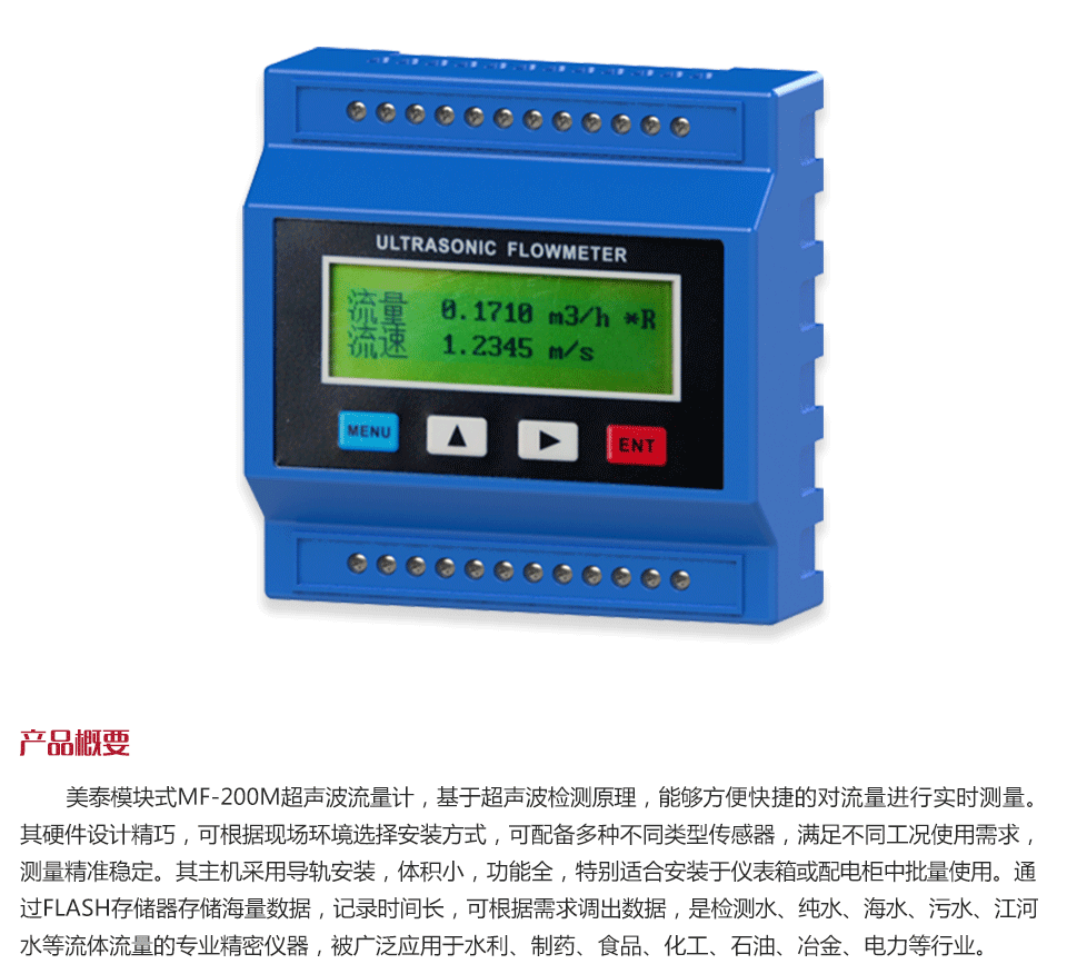 產品概述美泰模塊式MF-200M超聲波流量計,基于超聲波檢測原理,能夠方便快捷的對流量進行實時測量。其硬件設計精巧,可根據現場環境選擇安裝方式,可配備多種不同類型傳感器,滿足不同工況使用需求,測量精準穩定。其主機采用導軌安裝,體積小,功能全,特別適合安裝于儀表箱或配電柜中批量使用。通過FLASH存儲器存儲海量數據,記錄時間長,可根據需求調出數據,是檢測水、純水、海水、污水、、江河水等流體流量的專業精密儀器,被廣泛應用于水利、制藥、食品、化工、石油、冶金、電力等行業。