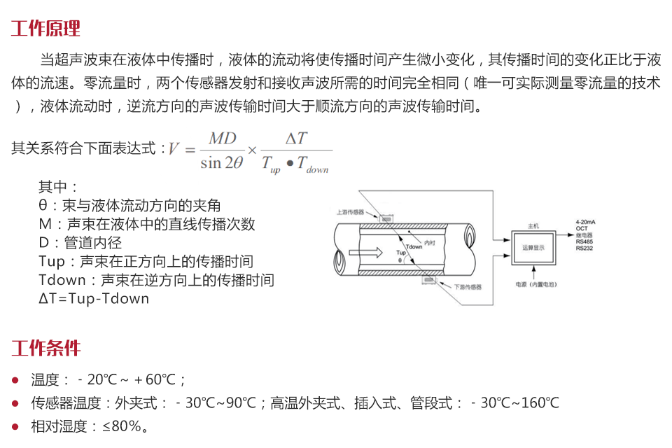 工作原理當超聲波束在液體中傳播時,液體的流動將使傳播時間產生微小變化,其傳播時間的變化正比于液體的流速。零流量時,兩個傳感器發射和接收聲波所需的時間完全相同(唯一可實際測量零流量的技術),液體流動時,逆流方向的聲波傳輸時間大于順流方向的聲波傳輸時間。