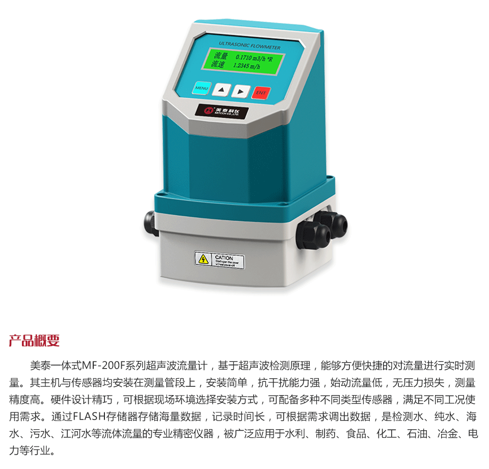 產品概述美泰一體式MF-200F系列超聲波流量計,基于超聲波檢測原理,能夠方便快捷的對流量進行實時測量。其主機與傳感器均安裝在測量管段上,安裝簡單,抗干擾能力強,始動流量低,無壓力損失,測量精度高。硬件設計精巧,可根據現場環境選擇安裝方式,可配備多種不同類型傳感器,滿足不同工況使用需求。通過FLASH存儲器存儲海量數據,記錄時間長,可根據需求調出數據,是檢測水、純水、海水、污水、江河水等流體流量的專業精密儀器,被廣泛應用于水利、制藥、食品、化工、石油、冶金、電力等行業。