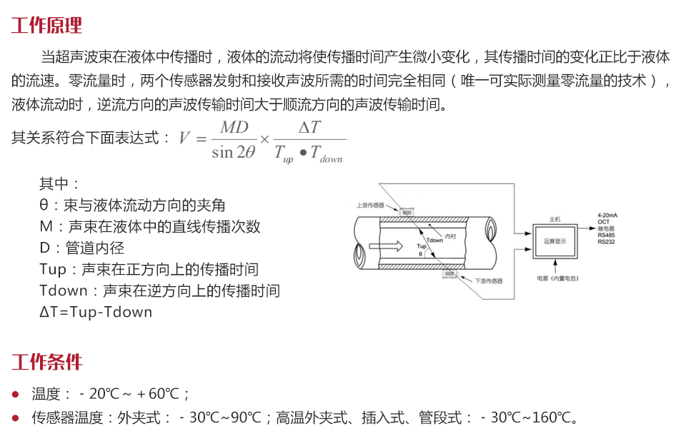 工作原理當超聲波束在液體中傳播時,液體的流動將使傳播時間產生微小變化,其傳播時間的變化正比于液體的流速。零流量時,兩個傳感器發射和接收聲波所需的時間完全相同(唯一可實際測量零流量的技術),液體流動時,逆流方向的聲波傳輸時間大于順流方向的聲波傳輸時間。