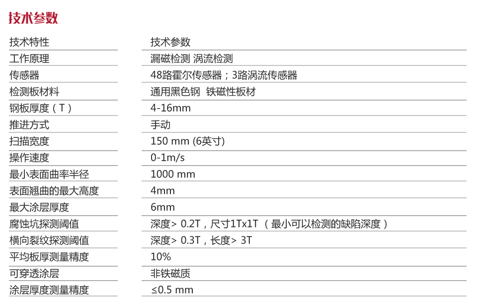 | 點(diǎn)腐蝕檢測(cè)閾值 | 深度> 0.2T,尺寸1Tx1T (由腐蝕產(chǎn)生的漏磁場(chǎng)磁感應(yīng)強(qiáng)度最小值) |
