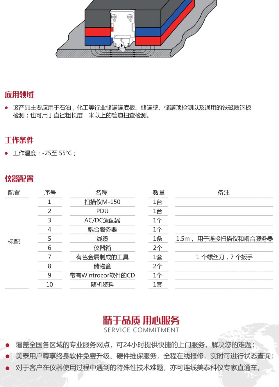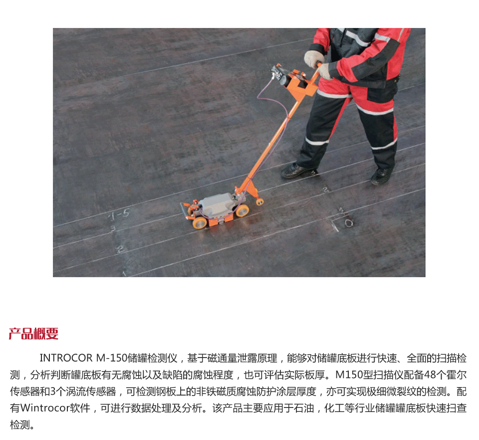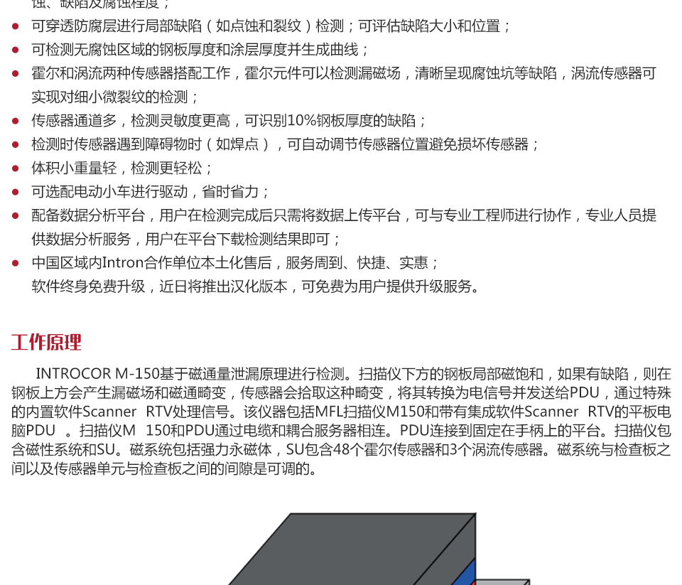 產(chǎn)品概述Intron M-150儲(chǔ)罐檢測(cè)儀,基于磁通量泄露原理,能夠?qū)?chǔ)罐底板進(jìn)行快速、全面的掃描檢測(cè),分析判斷罐底板有 無(wú)腐蝕以及缺陷的腐蝕程度,也可評(píng)估實(shí)際板厚。M150型掃描儀配備48個(gè)霍爾傳感器和3個(gè)渦流傳感器,可檢測(cè)鋼板上 的非鐵磁質(zhì)腐蝕防護(hù)涂層厚度,亦可實(shí)現(xiàn)極細(xì)微裂紋的檢測(cè)。配有Wintrocor軟件,可進(jìn)行數(shù)據(jù)處理及分析。該產(chǎn)品主 要應(yīng)用于石油,化工等行業(yè)儲(chǔ)罐罐底板快速掃查檢測(cè)。