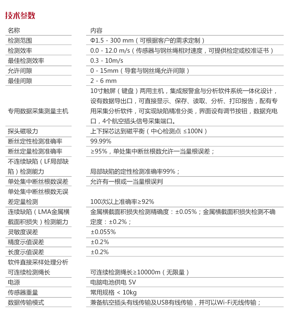 | 連續缺陷(LMA金屬橫截面積損失)檢測能力: | 金屬橫截面積損失檢測精確度:±0.05%;金屬橫截面積損失檢測不確定度:±0.2%; |
