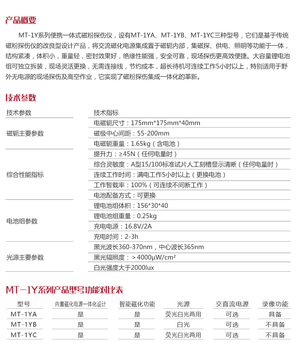 產品概述MT-1Y系列便攜一體式磁粉探傷儀,設有MT-1YA、MT-1YB、MT-1YC三種型號,它們是基于傳統磁粉探傷儀的改良型設計產品,將交流磁化電源集成置于磁軛內部,集磁探、供電、照明等功能于一體,結構緊湊,體積小,重量輕,密封效果好,絕緣性能強,安全可靠,現場探傷更高效便捷。大容量鋰電池組可獨立拆裝,現場靈活更換,無需連接線,節約成本,超長待機可連續工作5小時以上,特別適用于野外無電源的現場探傷及高空作業,它實現了磁粉探傷集成一體化的革新。