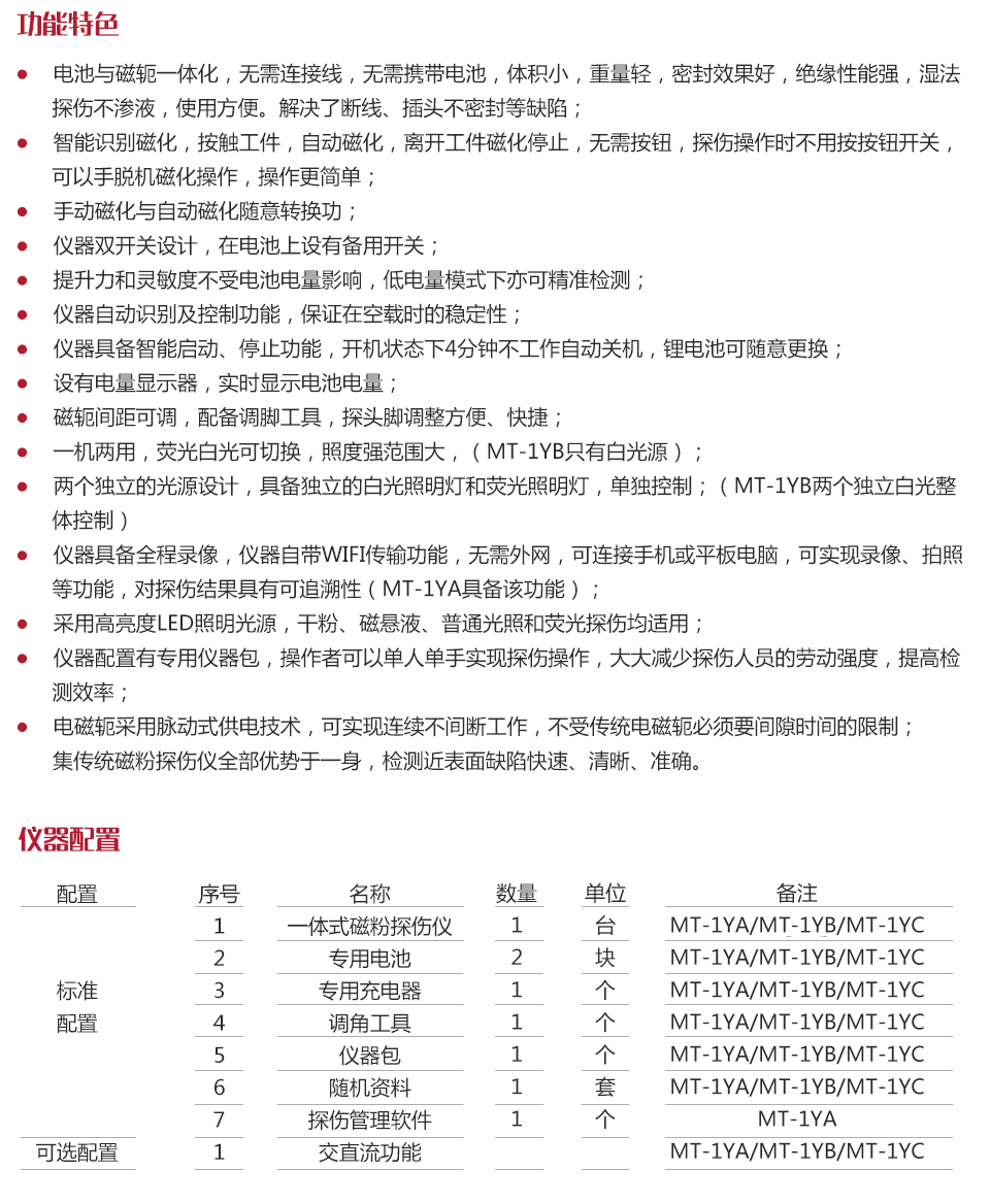 功能用途MT-1Y系列便攜一體式磁粉探傷儀,設有MT-1YA、MT-1YB、MT-1YC三種型號,它們是基于傳統磁粉探傷儀的改良型設計產品,將交流磁化電源集成置于磁軛內部,集磁探、供電、照明等功能于一體,結構緊湊,體積小,重量輕,密封效果好,絕緣性能強,安全可靠,現場探傷更高效便捷。大容量鋰電池組可獨立拆裝,現場靈活更換,無需連接線,節約成本,超長待機可連續工作5小時以上,特別適用于野外無電源的現場探傷及高空作業,它實現了磁粉探傷集成一體化的革新。
