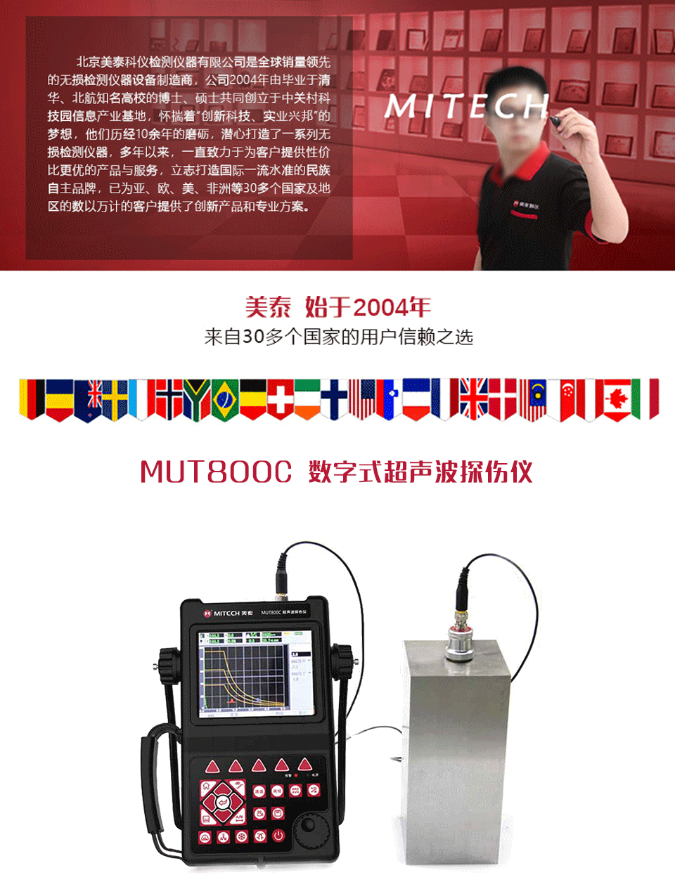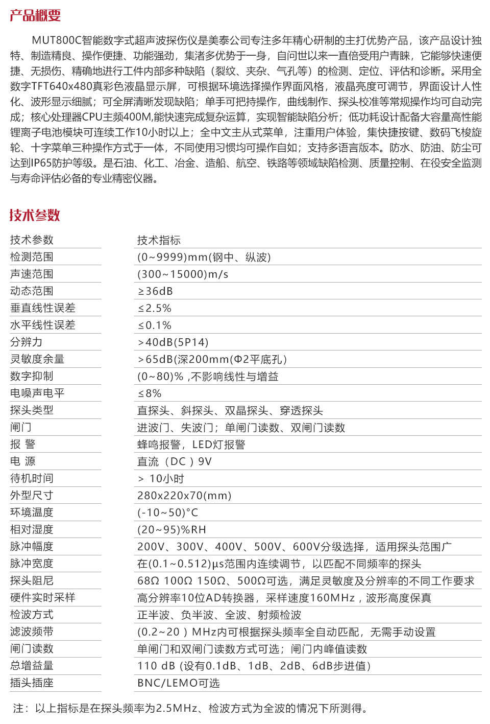 MUT800C智能數字式超聲波探傷儀是美泰公司專注多年精心研制的主打優勢產品,該產品設計獨特、制造精良、操作便捷、功能強勁,集諸多優勢于一身,自問世以來一直倍受用戶親睞,它能夠快速便捷、無損傷、精確地進行工件內部多種缺陷(裂紋、夾雜、氣孔等)的檢測、定位、評估和診斷。采用全數字TFT 640×480真彩色液晶顯示屏,可根據環境選擇操作界面風格,液晶亮度可調節,界面設計人性化、波形顯示細膩;可全屏清晰發現缺陷;單手可把持操作,曲線制作、探頭校準等常規操作均可自動完成;核心處理器CPU主頻400M,能快速完成復雜運算,實現智能缺陷分析;低功耗設計配備大容量高性能鋰離子電池模塊可連續工作10小時以上;全中文主從式菜單,注重用戶體驗,集快捷按鍵、數碼飛梭旋輪、十字菜單三種操作方式于一體,不同使用習慣均可操作自如;支持多語言版本。防水、防油、防塵可達到IP65防護等級。是石油、化工、冶金、造船、航空、鐵路等領域缺陷檢測、質量控制、在役安全監測與壽命評估必備的專業精密儀器。