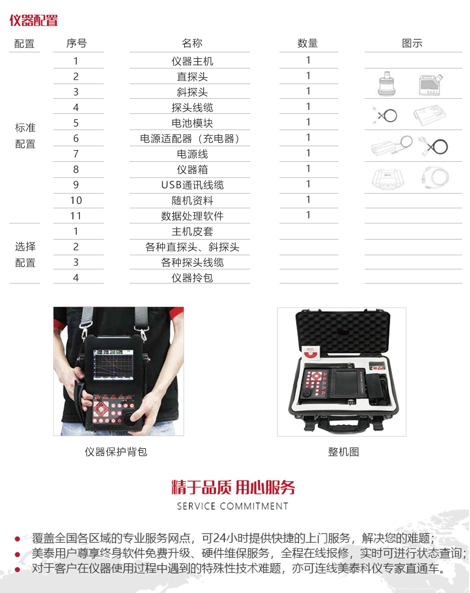 美泰超聲波探傷儀附有專用的隨機裝箱資料。包括產品合格證、保修卡、產品說明書、裝箱清單。隨機資料采用專用的銅版紙印制,說明書圖文設計,美觀、易懂、便于長久保存。注:美泰品牌系列產品的隨機資料均可登陸www.jszhengliang.com下載電子版。