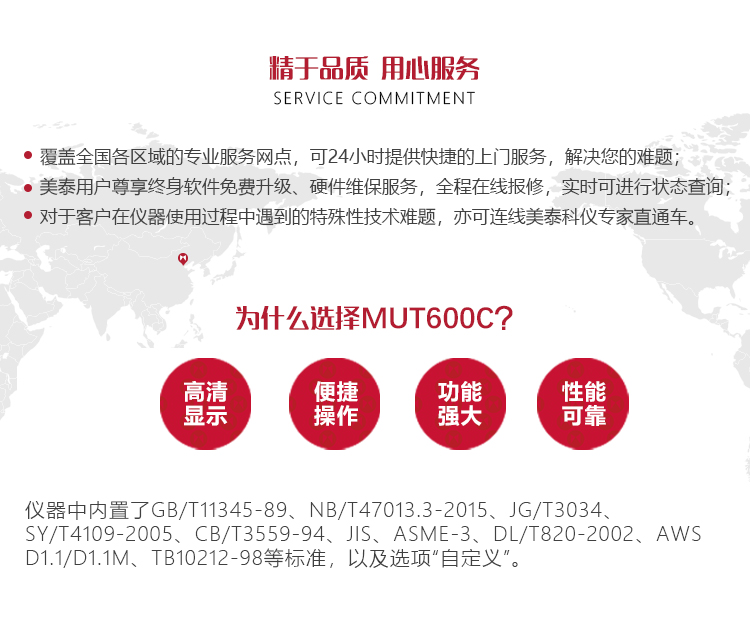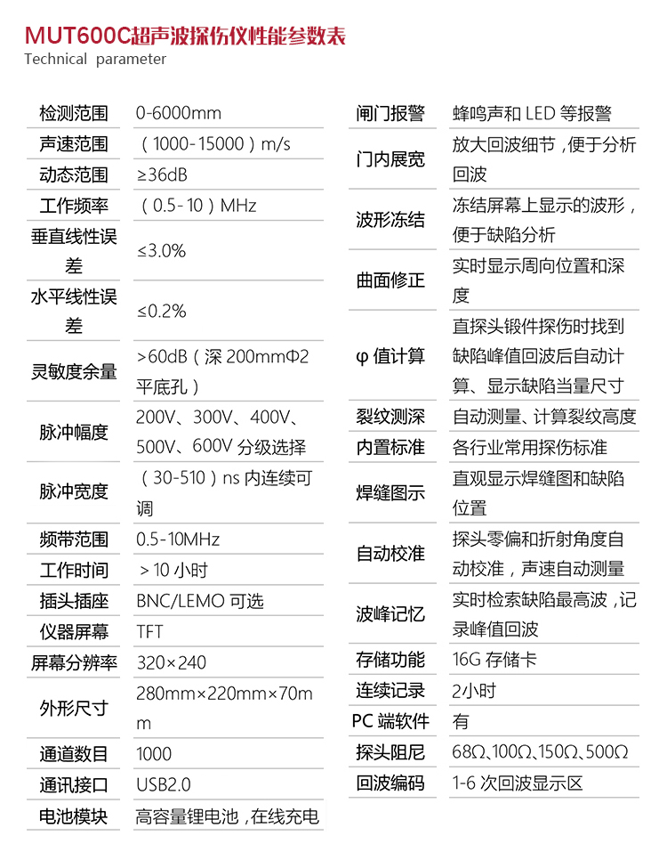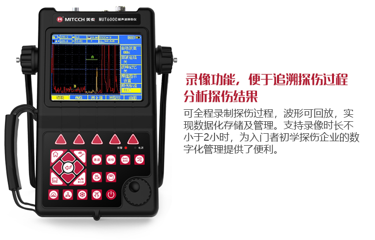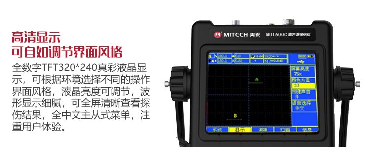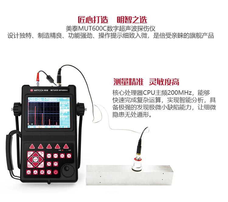 產品概述MUT600C數字式超聲波探傷儀基于超聲傳播原理,可精準、靈敏地進行工件內部多種缺陷(裂紋、夾雜、氣孔等)的檢測、定位、評估和診斷。采用全數字TFT 320×240真彩色液晶顯示屏,可根據環境選擇操作界面風格,液晶亮度可調節,界面設計人性化、波形顯示細膩;可全屏清晰發現缺陷;單手可把持操作,曲線制作、探頭校準等操作均可自動完成;既可用以用于實驗室,也可以用于工程現場。0-6000mm普通量程可滿足制造業、鋼鐵冶金業、金屬加工也、化工業等常規的缺陷檢測需求,低功耗設計配備大容量高性能鋰離子電池模塊可連續工作10小時以上;質優價廉,是實用經濟款超聲檢測儀器的首選。