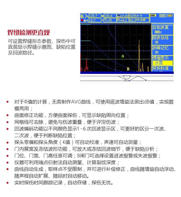 | 焊縫圖示 | 可設置焊縫形態參數,探傷中直觀顯示焊縫圖和缺陷在焊縫中的位置 |