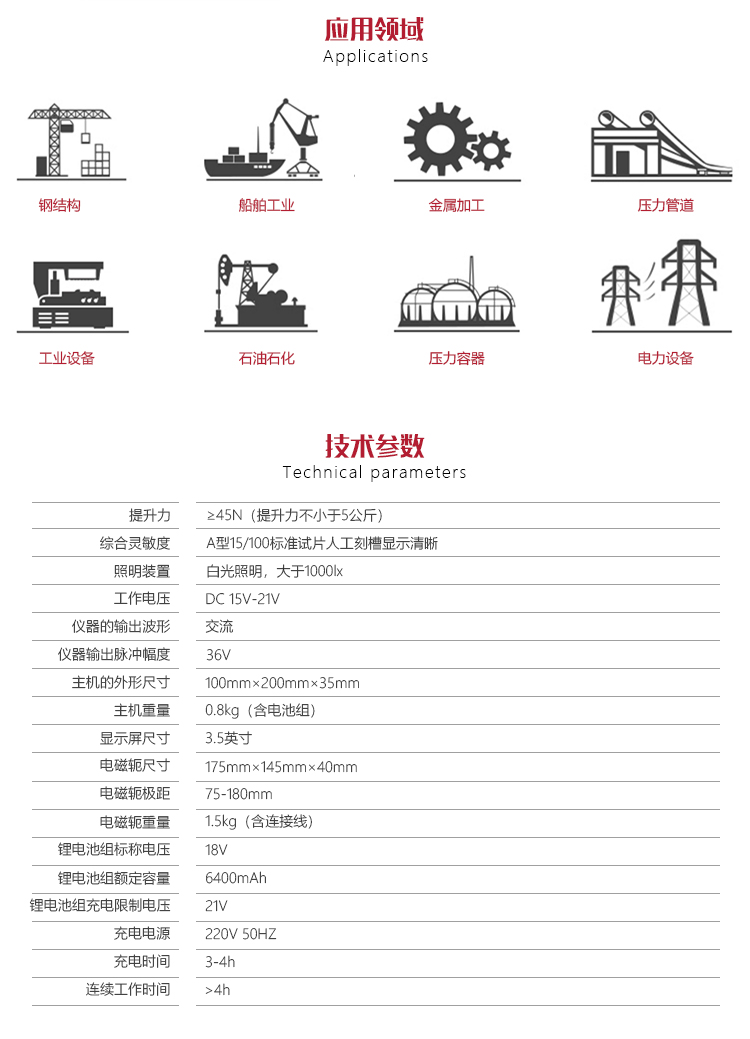 功能用途飛機制造、鍋爐壓力容器、電力、油田、造船、汽輪機和內燃機配件、煤礦、機械、標準件、油泵油嘴、汽車零件、造橋、化工、鐵路、大型機械零部件、鋼結構設備等行業產品;因鍛壓、淬火、焊接、疲勞等引起的表面及近表面缺陷,如鏈桿、曲軸、軸承、高強度螺栓、彈簧、鍛件、石化管件、閥門、葉片、齒輪、錨鏈以及焊縫等幾何形狀復雜的工件等。