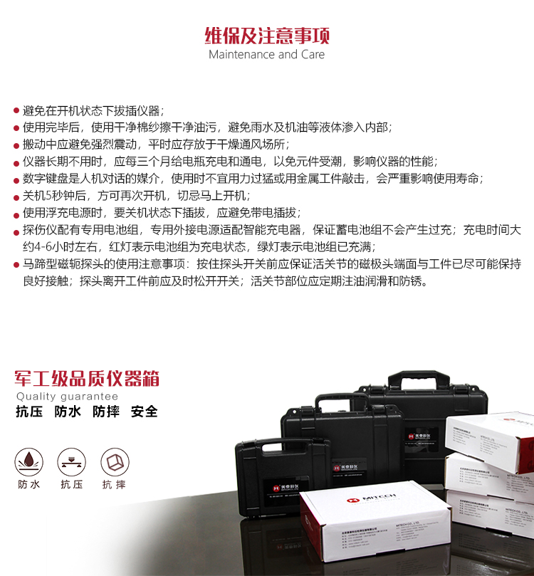 儀器的保養與維護數字便攜式磁粉探傷儀屬于精密檢測儀器,使用中要注意下列事項:
