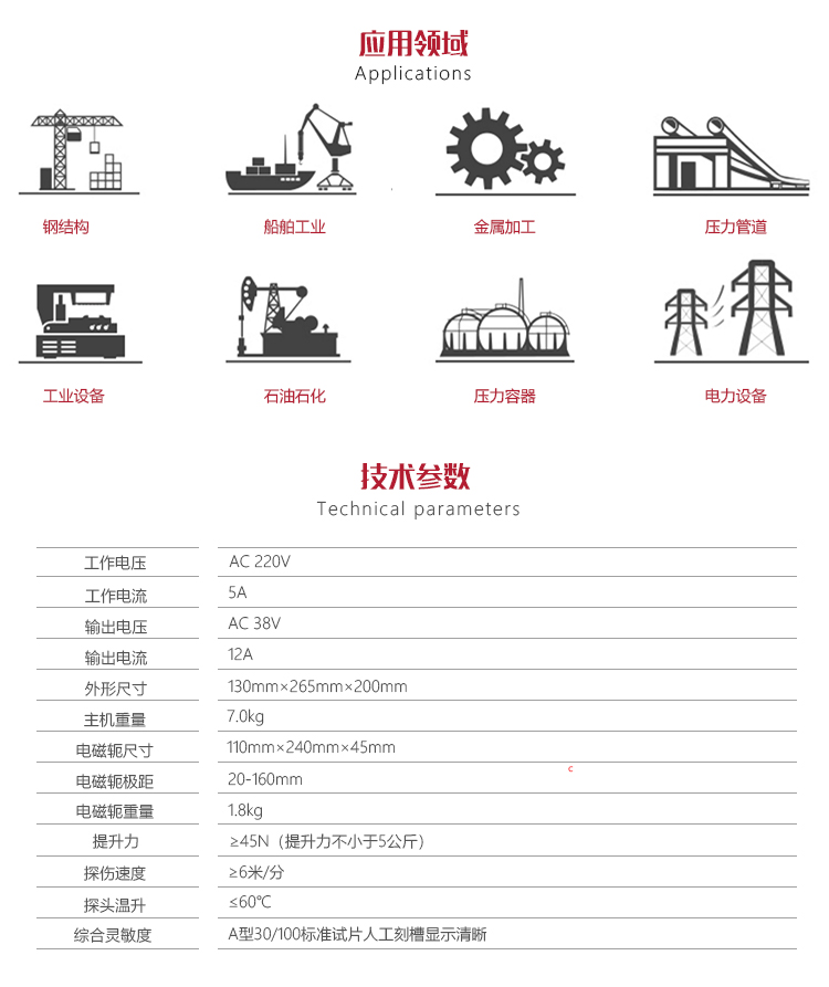 功能用途飛機制造、鍋爐壓力容器、電力、油田、造船、汽輪機和內(nèi)燃機配件、煤礦、機械、標準件、油泵油嘴、汽車零件、造橋、化工、鐵路、大型機械零部件、鋼結(jié)構(gòu)設備等行業(yè)產(chǎn)品;因鍛壓、淬火、焊接、疲勞等引起的表面及近表面缺陷,如鏈桿、曲軸、軸承、高強度螺栓、彈簧、鍛件、石化管件、閥門、葉片、齒輪、錨鏈以及焊縫等幾何形狀復雜的工件等。