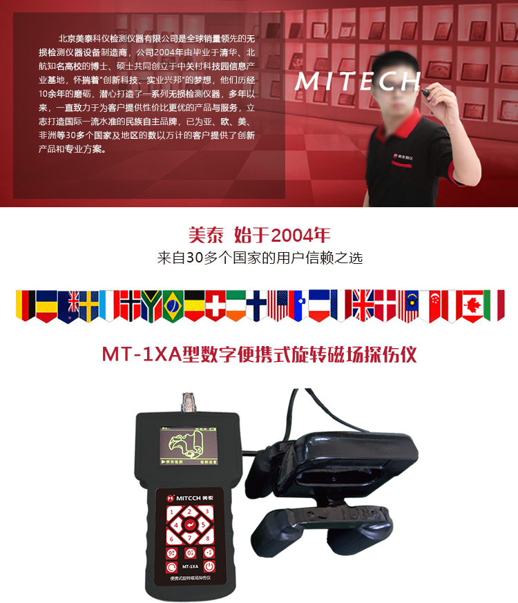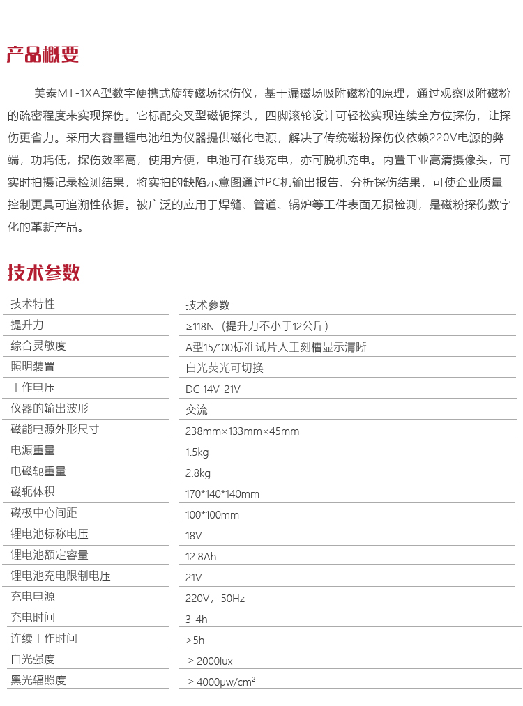 產(chǎn)品概述美泰MT-1XA型數(shù)字便攜式旋轉(zhuǎn)磁場探傷儀,基于漏磁場吸附磁粉的原理,通過觀察吸附磁粉的疏密程度來實(shí)現(xiàn)探傷。它標(biāo)配交叉型磁軛探頭,四腳滾輪設(shè)計(jì)可輕松實(shí)現(xiàn)連續(xù)全方位探傷,讓探傷更省力。采用大容量鋰電池組為儀器提供磁化電源,解決了傳統(tǒng)磁粉探傷儀依賴220V電源的弊端,功耗低,探傷效率高,使用方便,電池可在線充電,亦可脫機(jī)充電。內(nèi)置工業(yè)高清攝像頭,可實(shí)時(shí)拍攝記錄檢測結(jié)果,將實(shí)拍的缺陷示意圖通過PC機(jī)輸出報(bào)告、分析探傷結(jié)果,可使企業(yè)質(zhì)量控制更具可追溯性依據(jù)。被廣泛的應(yīng)用于焊縫、管道、鍋爐等工件表面無損檢測,是磁粉探傷數(shù)字化的革新產(chǎn)品。