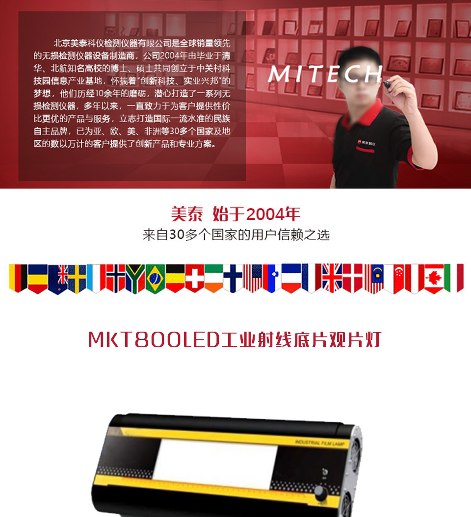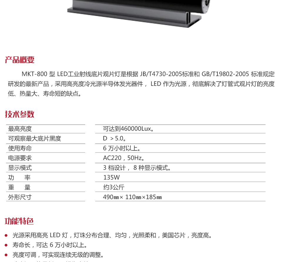 產品概述MKT-800 型 LED工業射線底片觀片燈是根據 JB/T4730-2005標準和 GB/T19802-2005 標準規定研發的最新產品,采用高亮度冷光源半導體發光器件, LED 作為光源,徹底解決了燈管式觀片燈的亮度低、熱量大、壽命短的缺點。