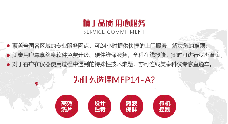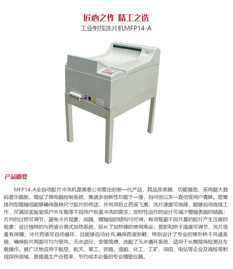 產品概述 MFP14-A全自動膠片沖洗機是美泰公司推出的新一代產品,其品質卓越、功能強勁,采用超大數碼顯示面板,增設了微電腦控制系統,集諸多創新性功能于一身,自問世以來一直倍受用戶青睞。密集排列型輥軸組能夠確保各種尺寸膠片的傳送,并有效防止藥液飛濺;洗片速度可選擇,能夠自動連續工作,可滿足實驗室或戶外車載等不同用戶批量沖洗的需求;定時性運轉的設計可減少輥軸表面的結晶;方向的過橋可調節,避免卡片現象;間隔、輥軸組的結構均可調,有效規避不同片基的膠片產生壓痕的現象;設計獨特的與藥液分離式加熱系統,延長了加熱棒的使用壽命;顯影和烘干溫度可調節,洗片質量有保障;沖片藥液可自動循環,且能夠自動補充,確保藥液保鮮;特別設計了專業的雛形烘干風道系統,確保膠片兩面可均勻受風,無水跡印;安裝簡便,選配了無水循環系統,適用于長期現場檢測及車載操作。被廣泛地應用于航空、航天、軍工、鐵路、造船、化工、工礦、油田、電站等企業及商檢等射線探傷領域,是提高生產合格率、節約成本必備的專業精密儀器。
