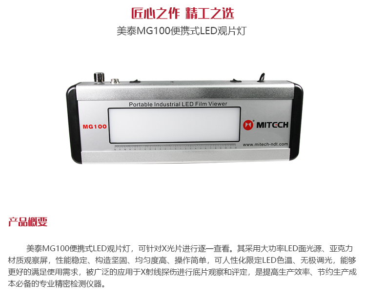 產(chǎn)品概述美泰MG100便攜式LED觀片燈,可針對X光片進行逐一查看。其采用大功率LED面光源、亞克力材質觀察屏,性能穩(wěn)定、構造堅固、均勻度高、操作簡單,可人性化限定LED色溫、無極調光,能夠更好的滿足使用需求,被廣泛的應用于X射線探傷進行底片觀察和評定,是提高生產(chǎn)效率、節(jié)約生產(chǎn)成本必備的專業(yè)精密檢測儀器。