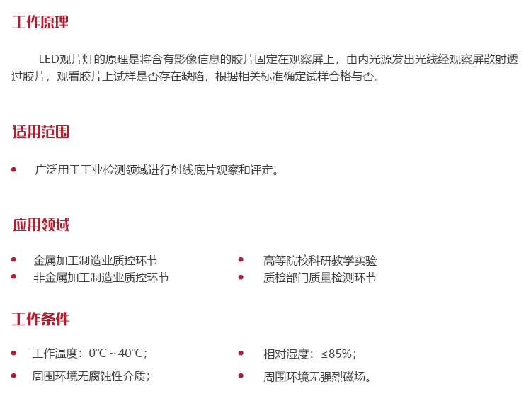 工作原理LED觀片燈的原理是將含有影像信息的膠片固定在觀察屏上,由內光源發(fā)出光線經(jīng)觀察屏散射透過膠片,觀看膠片上試樣是否存在缺陷,根據(jù)相關標準確定試樣合格與否。