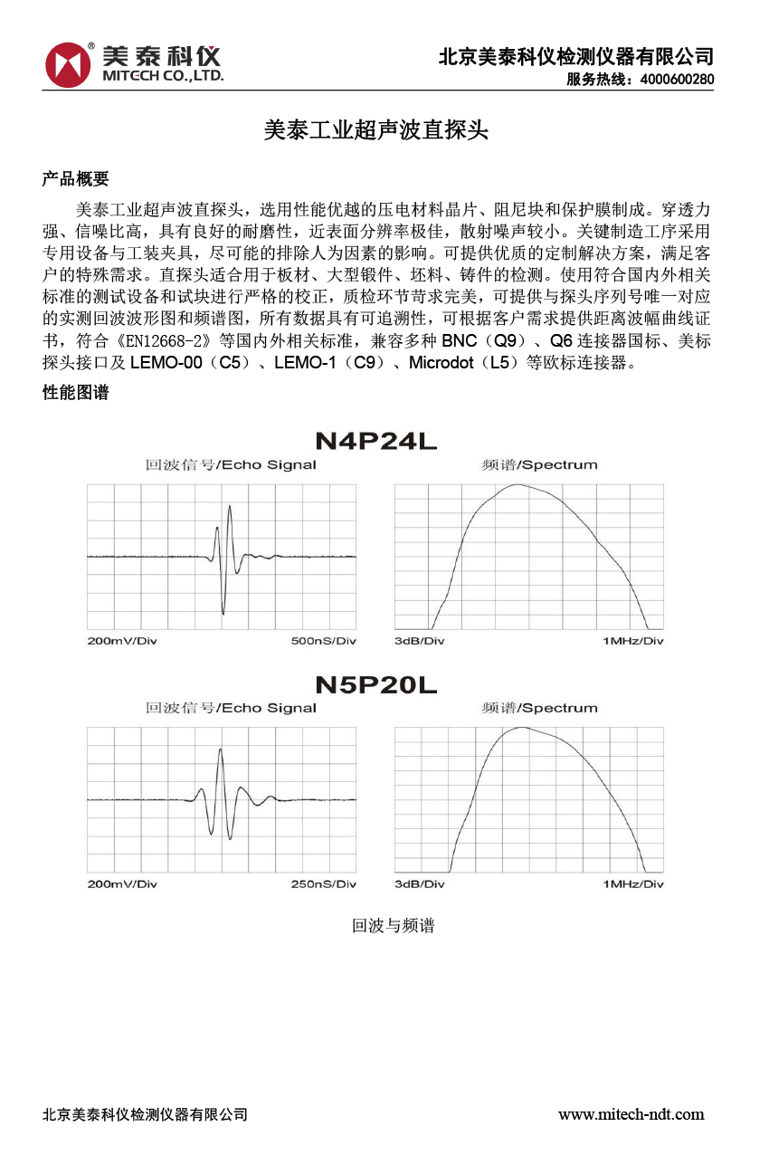產品概述美泰工業超聲波直探頭,選用性能優越的壓電材料晶片、阻尼塊和保護膜制成。穿透力強、信噪比高,具有良好的耐磨性,近表面分辨率極佳,散射噪聲較小。關鍵制造工序采用專用設備與工裝夾具,盡可能的排除人為因素的影響。可提供優質的定制解決方案,滿足客戶的特殊需求。直探頭適合用于板材、大型鍛件、坯料、鑄件的檢測。使用符合國內外相關標準的測試設備和試塊進行嚴格的校正,質檢環節苛求完美,可提供與探頭序列號唯一對應的實測回波波形圖和頻譜圖,所有數據具有可追溯性,可根據客戶需求提供距離波幅曲線證書,符合《EN12668-2》等國內外相關標準,兼容多種BNC(Q9)、Q6連接器國標、美標探頭接口及LEMO-00(C5)、LEMO-1(C9)、Microdot(L5)等歐標連接器。