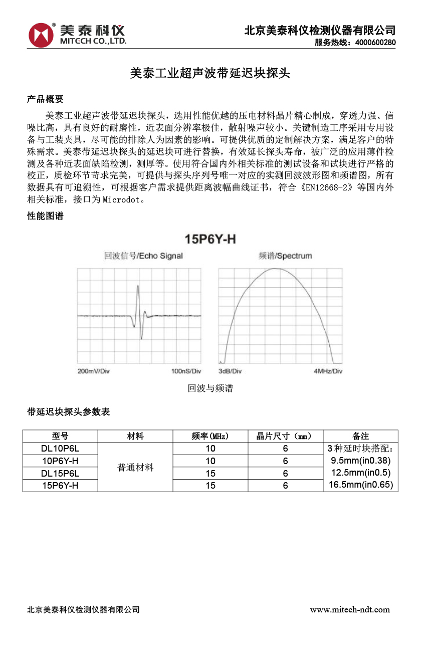 產品概述美泰工業超聲波帶延遲塊探頭,選用性能優越的壓電材料晶片精心制成,穿透力強、信噪比高,具有良好的耐磨性,近表面分辨率極佳,散射噪聲較小。關鍵制造工序采用專用設備與工裝夾具,盡可能的排除人為因素的影響。可提供優質的定制解決方案,滿足客戶的特殊需求。美泰帶延遲塊探頭的延遲塊可進行替換,有效延長探頭壽命,被廣泛的應用薄件檢測及各種近表面缺陷檢測,測厚等。使用符合國內外相關標準的測試設備和試塊進行嚴格的校正,質檢環節苛求完美,可提供與探頭序列號唯一對應的實測回波波形圖和頻譜圖,所有數據具有可追溯性,可根據客戶需求提供距離波幅曲線證書,符合《EN12668-2》等國內外相關標準,接口為Microdot。