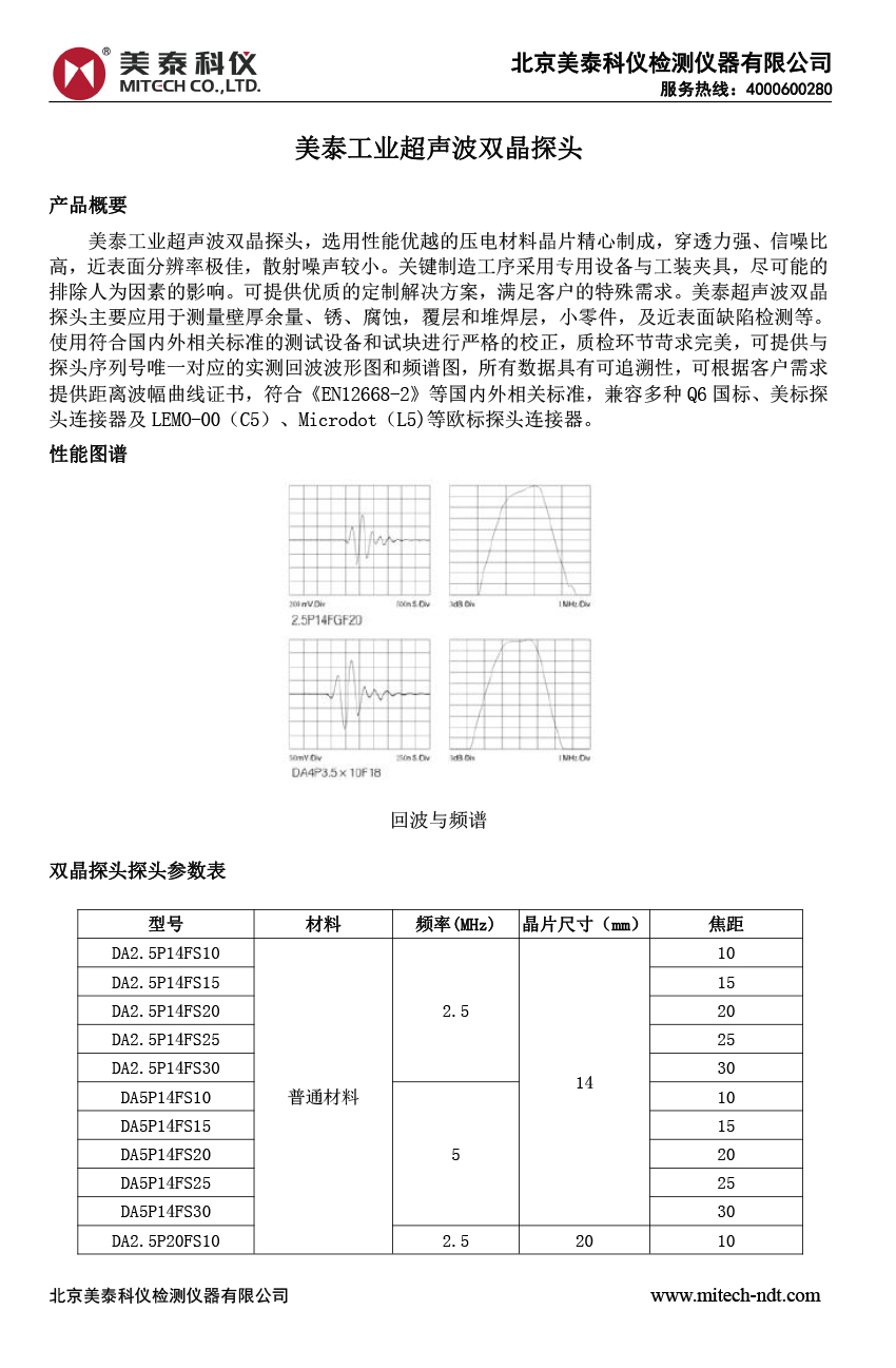 產品概述美泰工業超聲波雙晶探頭,選用性能優越的壓電材料晶片精心制成,穿透力強、信噪比高,近表面分辨率極佳,散射噪聲較小。關鍵制造工序采用專用設備與工裝夾具,盡可能的排除人為因素的影響??商峁﹥炠|的定制解決方案,滿足客戶的特殊需求。美泰超聲波雙晶探頭主要應用于測量壁厚余量、銹、腐蝕,覆層和堆焊層,小零件,及近表面缺陷檢測等。使用符合國內外相關標準的測試設備和試塊進行嚴格的校正,質檢環節苛求完美,可提供與探頭序列號唯一對應的實測回波波形圖和頻譜圖,所有數據具有可追溯性,可根據客戶需求提供距離波幅曲線證書,符合《EN12668-2》等國內外相關標準,兼容多種Q6國標、美標探頭連接器及LEMO-00(C5)、Microdot(L5)等歐標探頭連接器。