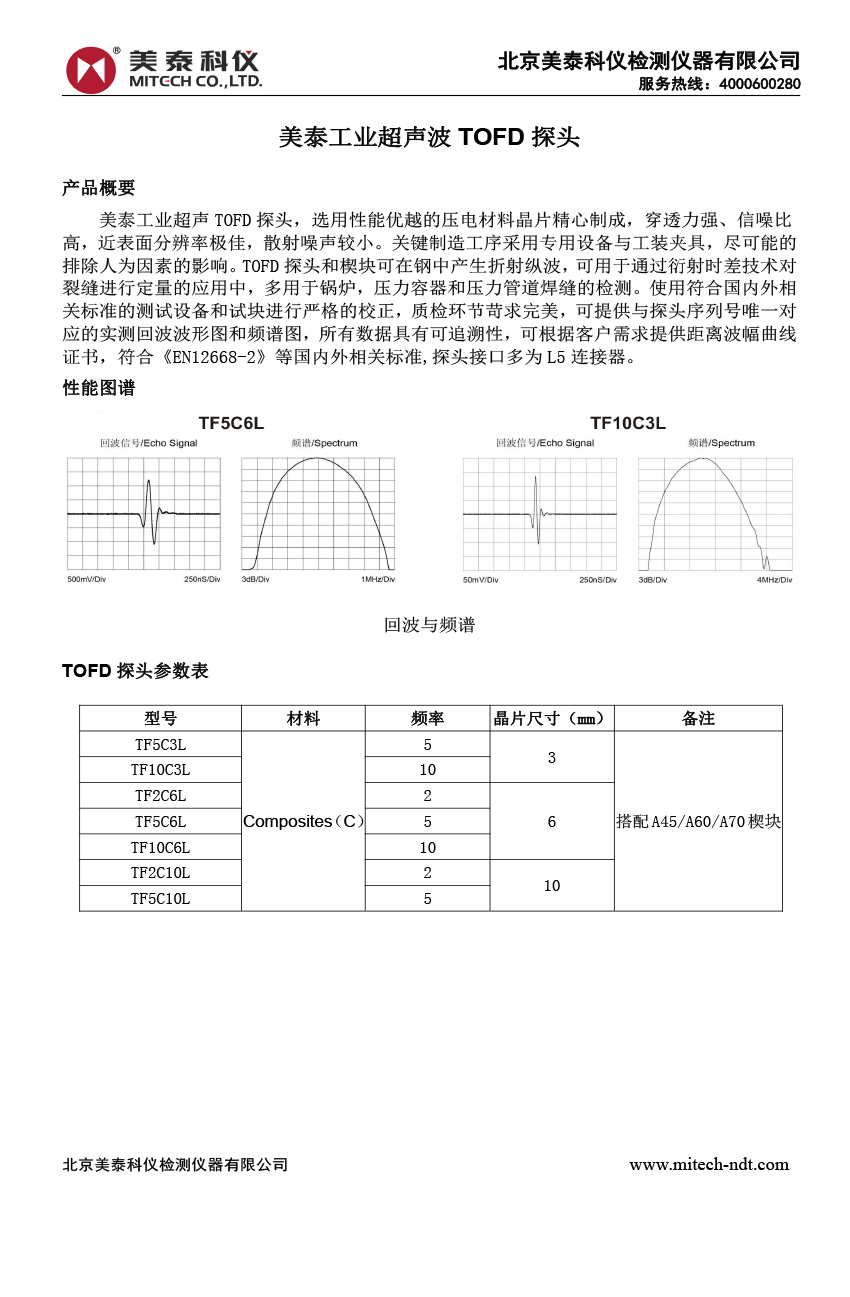 美泰工業(yè)超聲TOFD探頭,選用性能優(yōu)越的壓電材料晶片精心制成,穿透力強(qiáng)、信噪比高,近表面分辨率極佳,散射噪聲較小。關(guān)鍵制造工序采用專用設(shè)備與工裝夾具,盡可能的排除人為因素的影響。TOFD探頭和楔塊可在鋼中產(chǎn)生折射縱波,可用于通過衍射時差技術(shù)對裂縫進(jìn)行定量的應(yīng)用中,多用于鍋爐,壓力容器和壓力管道焊縫的檢測。使用符合國內(nèi)外相關(guān)標(biāo)準(zhǔn)的測試設(shè)備和試塊進(jìn)行嚴(yán)格的校正,質(zhì)檢環(huán)節(jié)苛求完美,可提供與探頭序列號唯一對應(yīng)的實(shí)測回波波形圖和頻譜圖,所有數(shù)據(jù)具有可追溯性,可根據(jù)客戶需求提供距離波幅曲線證書,符合《EN12668-2》等國內(nèi)外相關(guān)標(biāo)準(zhǔn),探頭接口多為L5連接器。