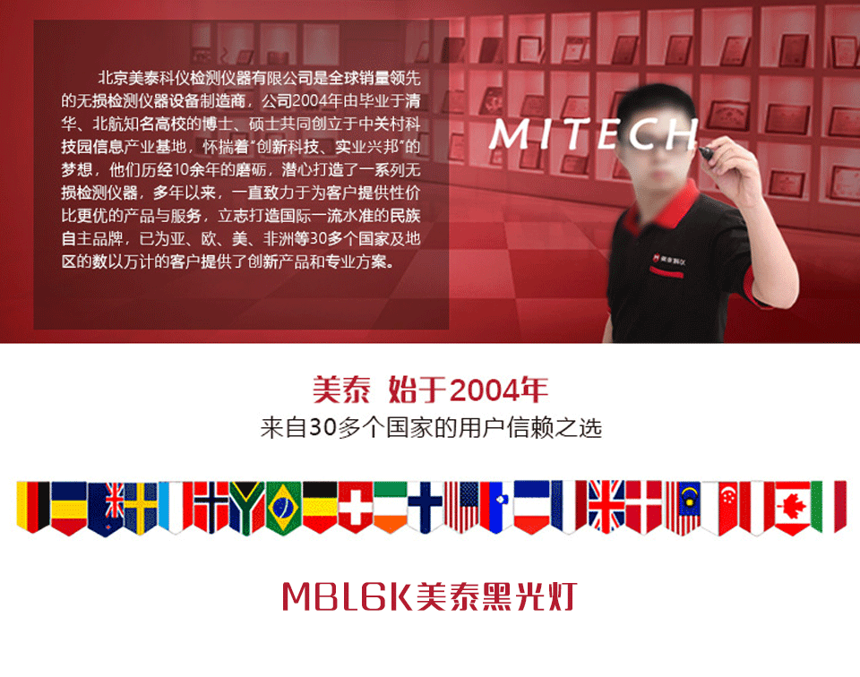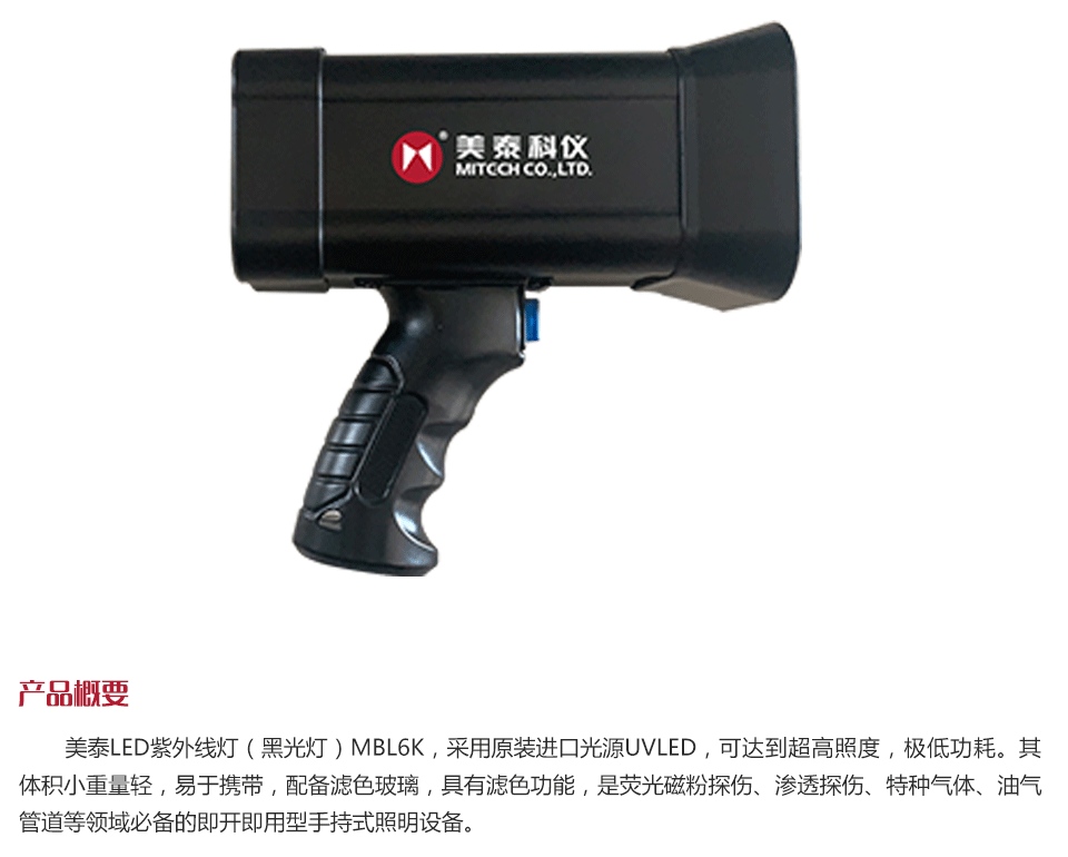 美泰LED紫外線燈(黑光燈)MBL6K,采用原裝進口光源UVLED,可達到超高照度,極低功耗。其體積小重量輕,易于攜帶,配備濾色玻璃,具有濾色功能,是熒光磁粉探傷、滲透探傷、特種氣體、油氣管道等領域必備的即開即用型手持式照明設備。