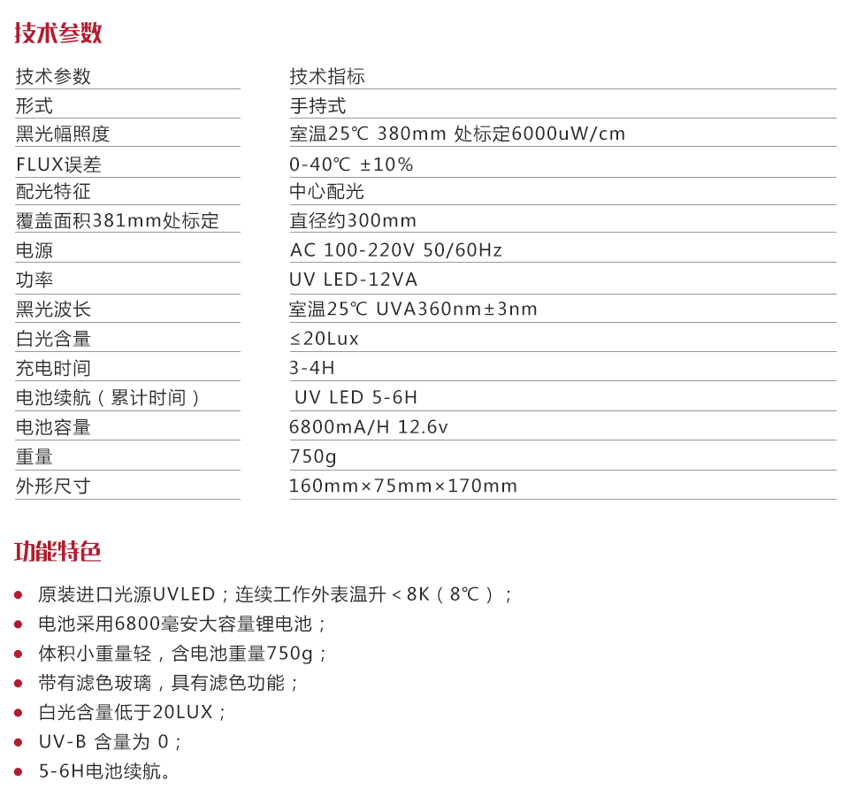 | 黑光幅照度 | 室溫25℃ 380mm 處標定6000uW/cm2 |