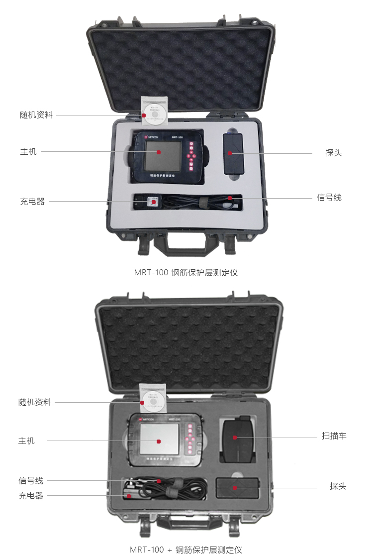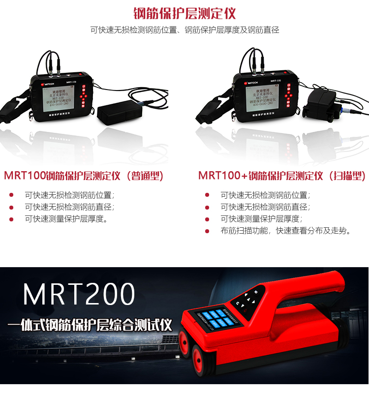 產品概述美泰MRT-100 / MRT-100 +鋼筋保護層測定儀,基于電磁感應原理,可快速無損檢測鋼筋位置、鋼筋保護層厚度及鋼筋直徑。其測量速度快、測量精度高、性能穩定可靠,具有布筋掃描功能(MRT-100 +),適用于對現有鋼筋混凝土工程及新建鋼筋混凝土結構施工質量的檢測,也可對非磁性和非導電介質中的磁性體及導電體的位置進行檢測,是一款專業多功能智能型精密無損檢測儀器。