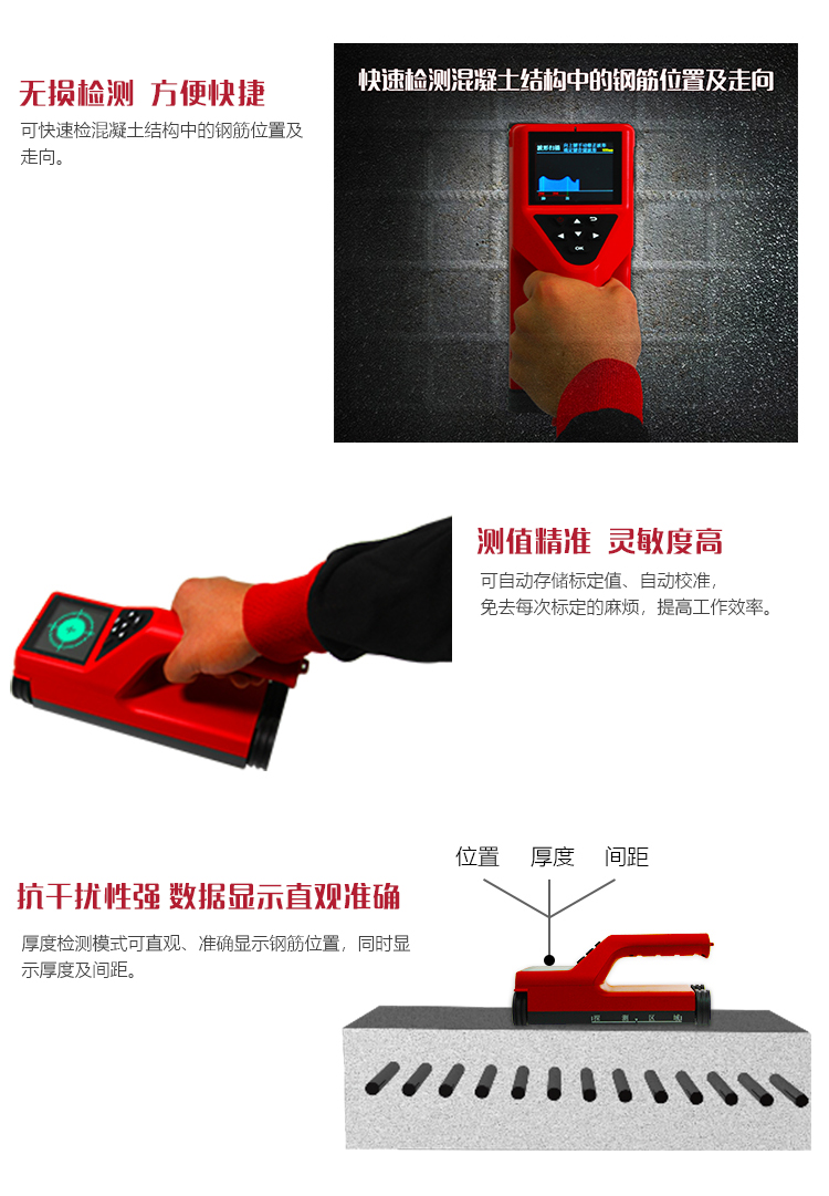 l 廣泛應(yīng)用于對現(xiàn)有鋼筋混凝土工程及新建鋼筋混凝土結(jié)構(gòu)施工質(zhì)量的檢測,也可對非磁性和非導電介質(zhì)中的磁性體及導電體的位置進行檢測;