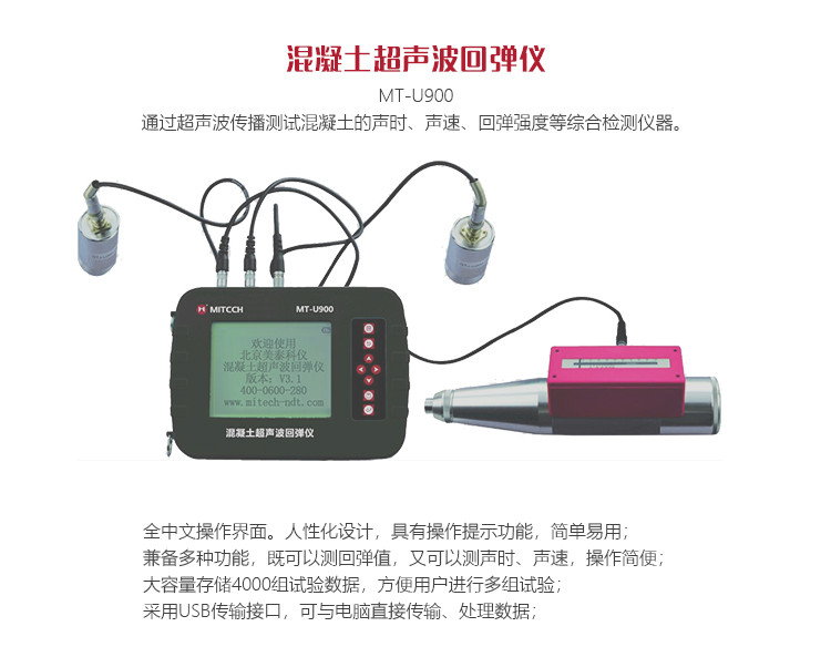 工作原理美泰MT-U900混凝土超聲波回彈儀,是一款功能強大的混凝土綜合檢測儀器。除具備普通回彈儀的強度測試功能外,可通過超聲波傳播測試混凝土的聲時、聲速等數值。其采用進口傳感器及先進的ARM處理器,測量快速準確,適用于各類建筑工程中普通混凝土抗壓強度的無損檢測,是保障工程質量、節約生產成本必備的精密檢測儀器。