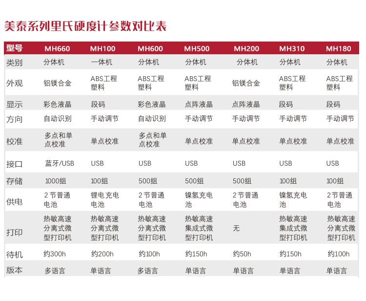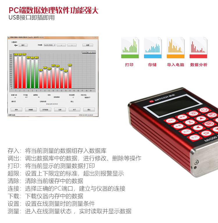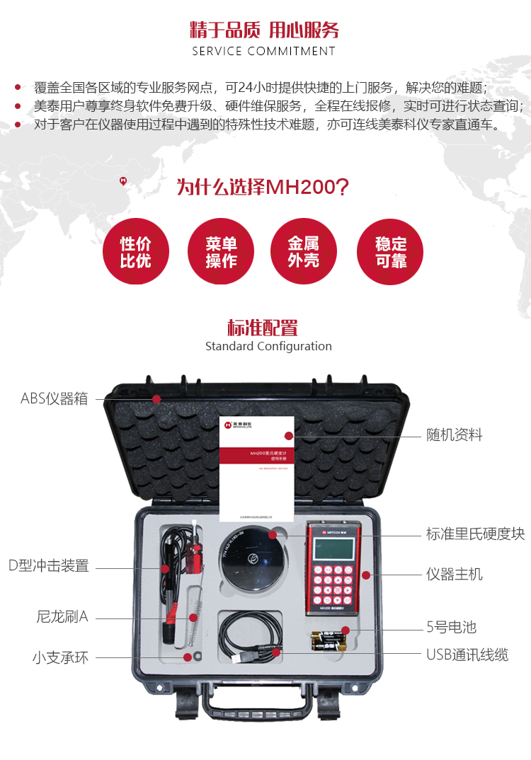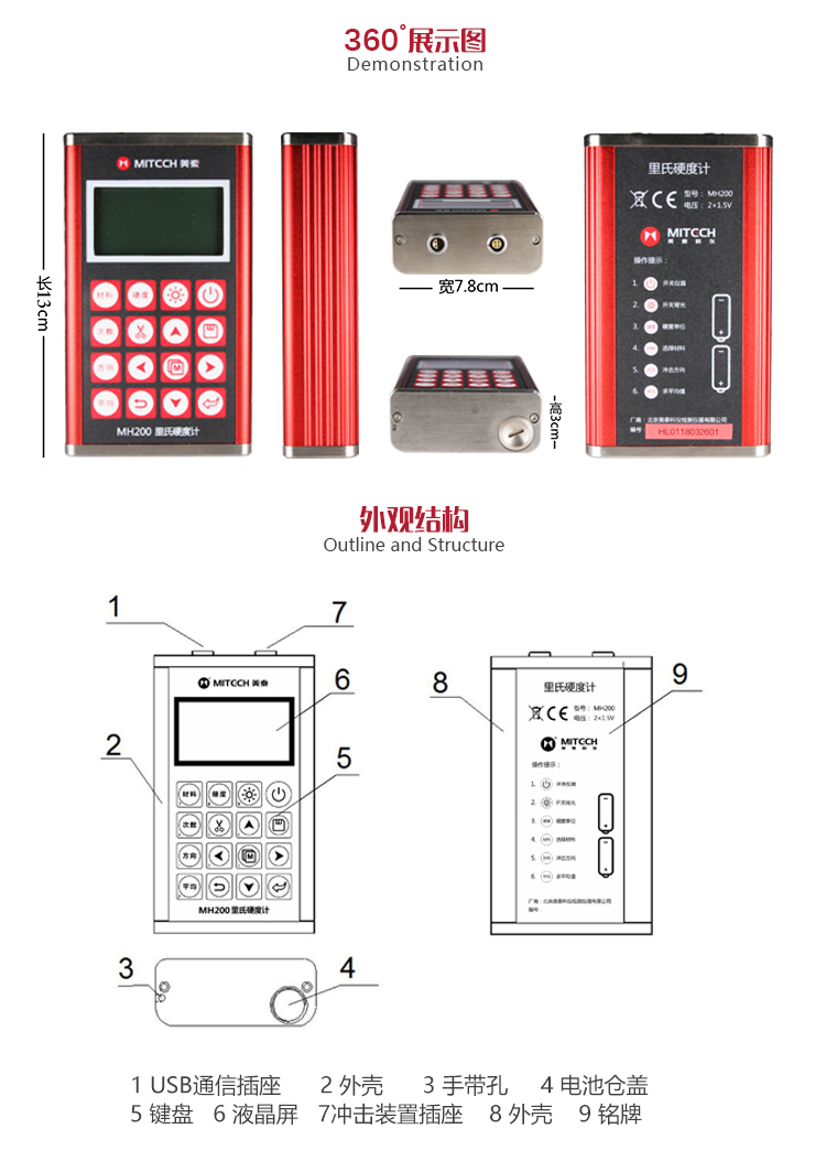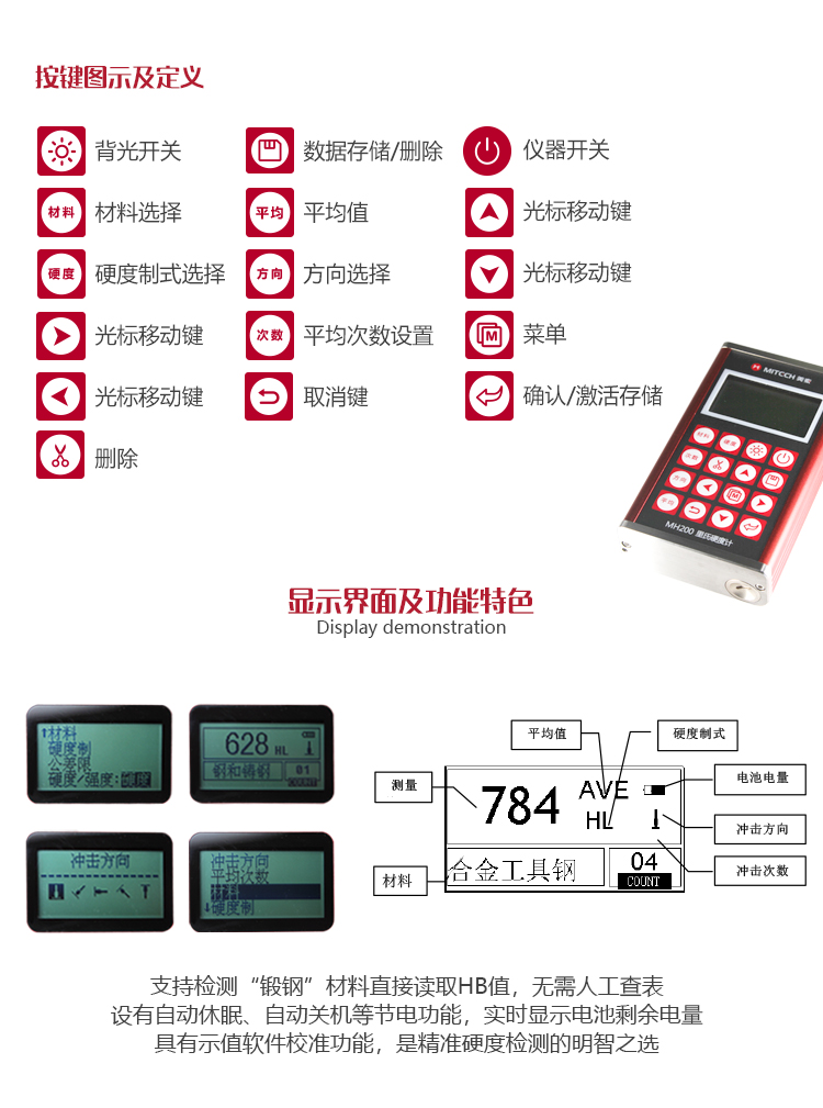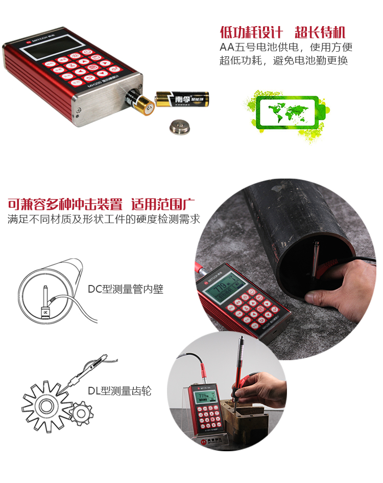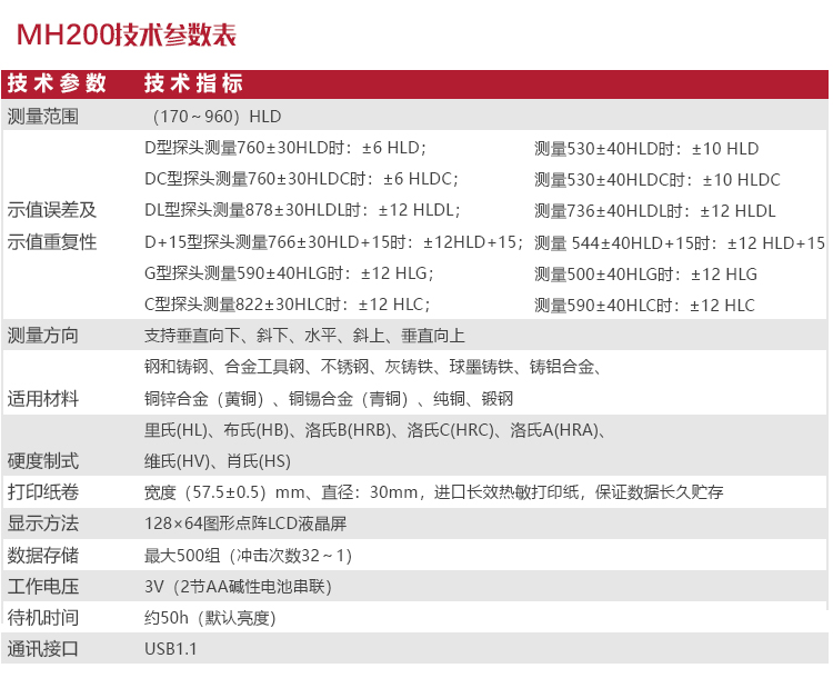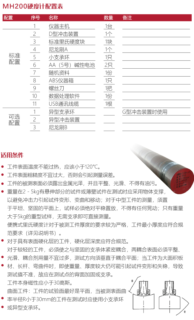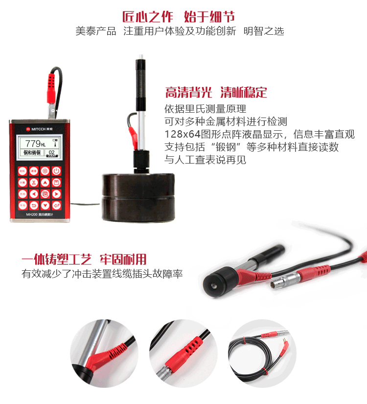 產品概述MH200便攜式里氏硬度計,基于里氏硬度測量原理,可方便快捷地現場檢測多種金屬材料的硬度,支持里氏、布氏、洛氏等多種硬度制氏間的自由轉換。它采用國際流行的全封閉鋁美合金外殼,堅固耐用,擁有強大的抗電磁、抗振動、抗干擾能力;低功耗設計依托穩定的IC集成電路,性能可靠;全中文點陣液晶顯示,菜單式操作簡單快捷;支持PC機通訊及打印功能。被廣泛應用于退火、回火、淬火熱處理工件的質量控制;機床導軌、汽車底盤的硬度檢測;大型不可拆卸零部件的現場在役硬度測試;五金、鍛造、機床、特種鋼材的質量檢測;批量生產過程中產品的質量控制等,質優價廉,實用經濟,是硬度檢測常規需求的明智之選。